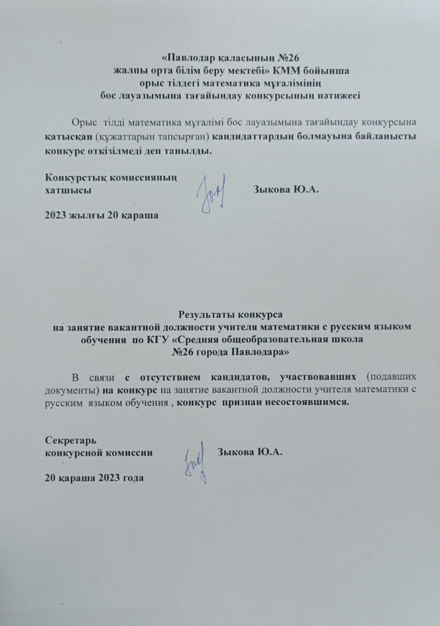 КГУ «Средняя общеобразовательная школа № 26 города Павлодара» объявляет конкурс на должность учителя математики с русским языком обучения (1 вакансия) (02.10.2023) | Скачать Смотреть |