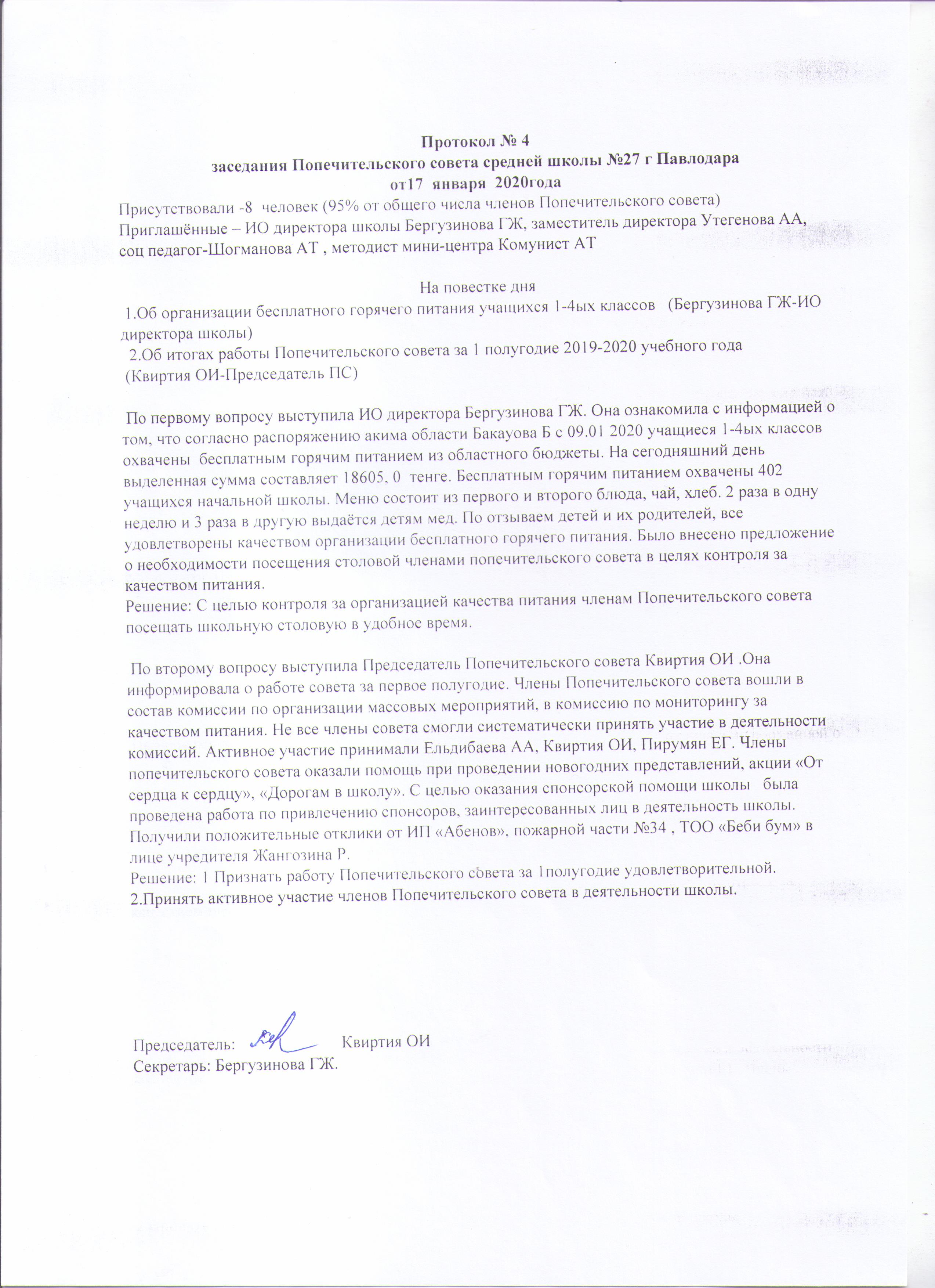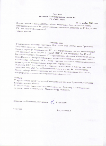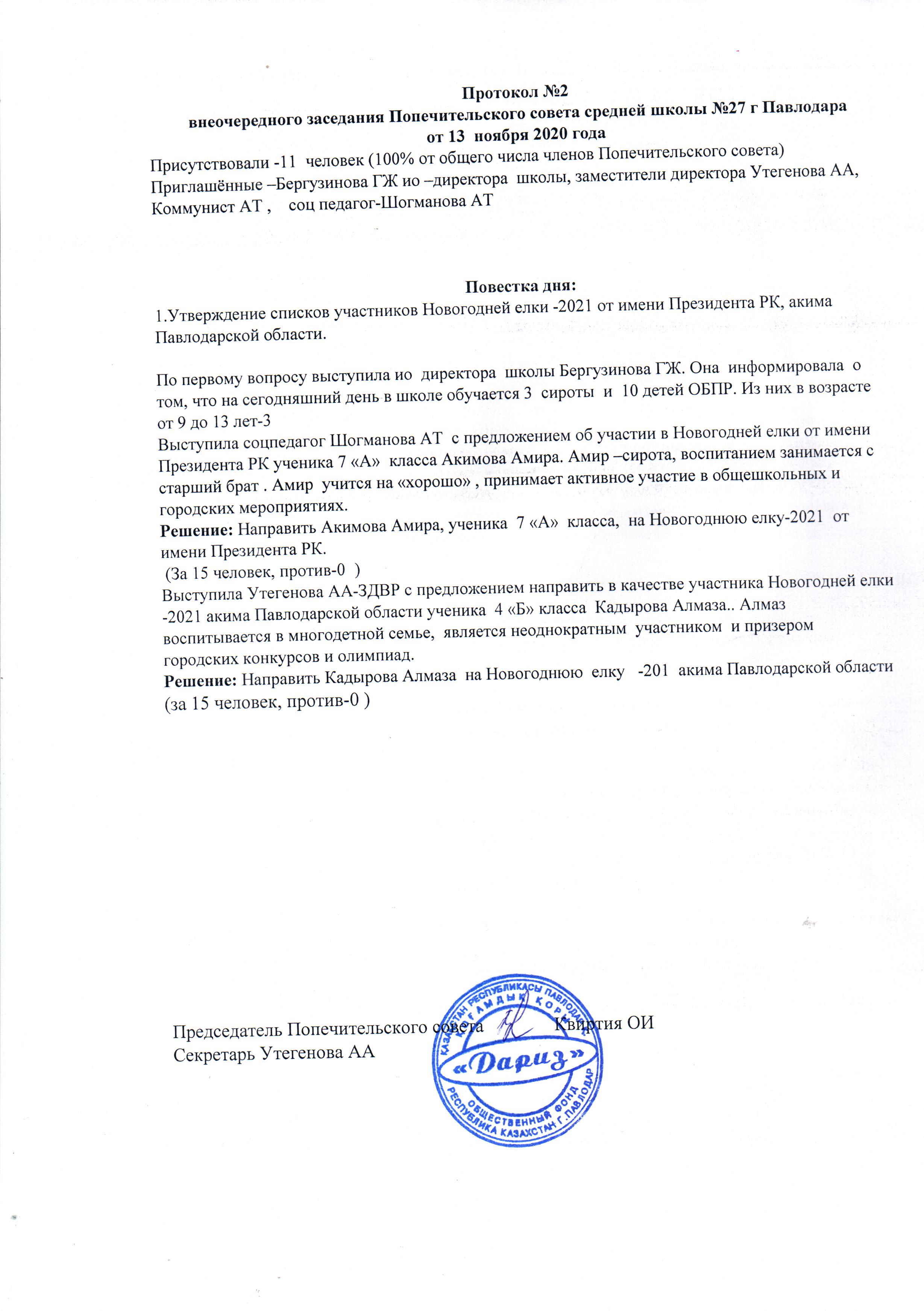 Протокол №2 внеочередного Заседания Попечительского совета средней школы №27 г. Павлодар от 13 ноября 2020 года | Скачать |