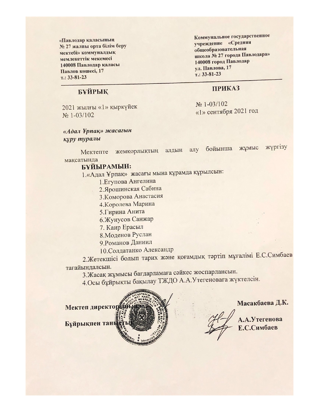 Приказ о создании кружка "Адал ұрпақ" №1 - 03/102 от 1 сентября 2021 года | Скачать |