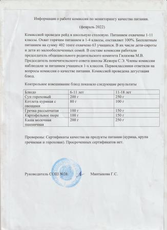 Информация о работе комиссии по мониторингу питания (февраль 2022г)