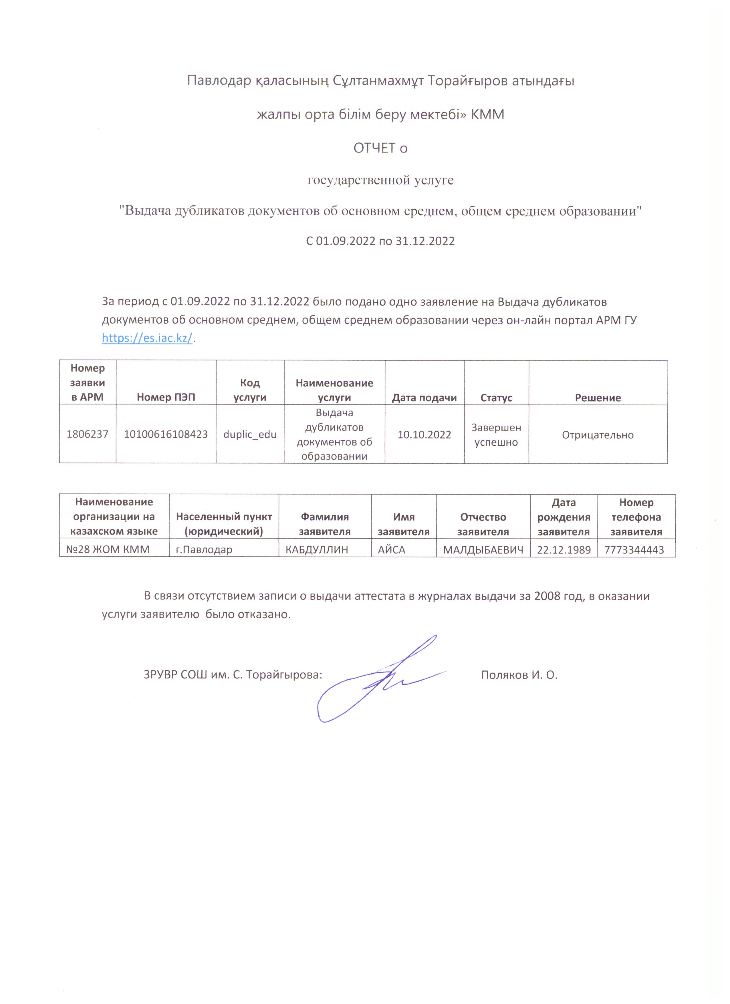 ОТЧЕТ о государственной услуге "Выдача дубликатов документов об основном среднем, общем среднем образовании" | Скачать |