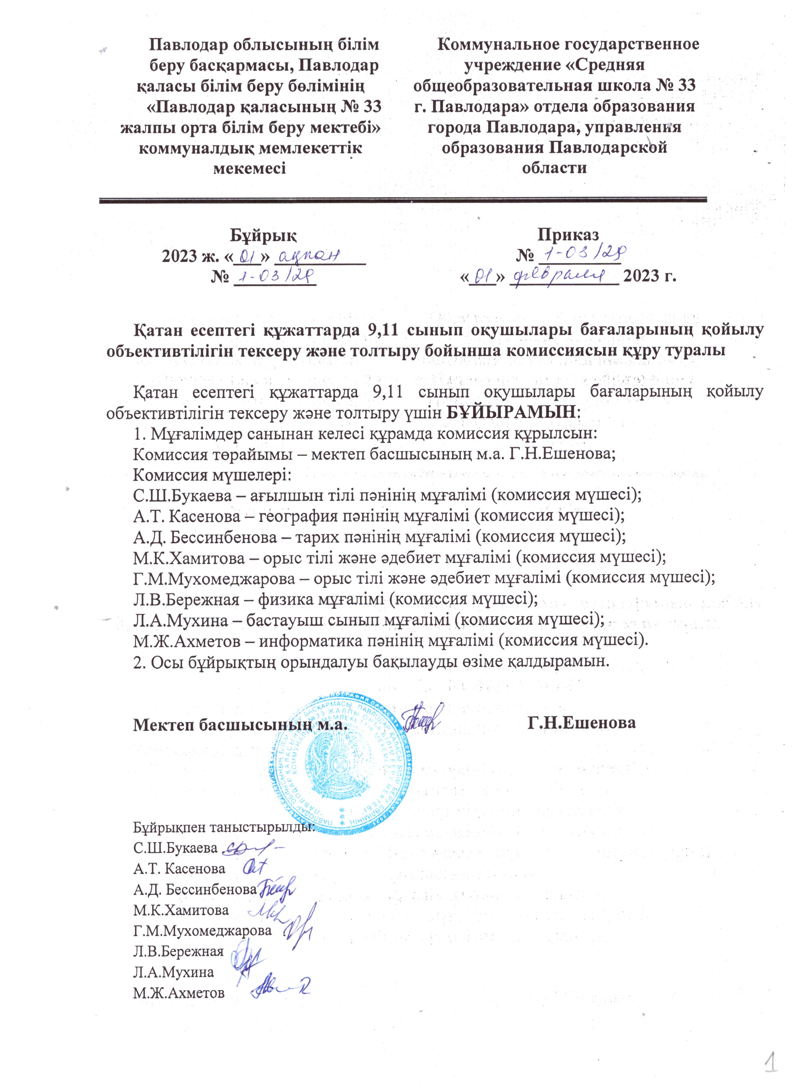 приказ о создании комиссии по заполнению документов строгой отчётности и объективности оценок учащихся 9, 11 классов 2022-2023 уч.год | Скачать |