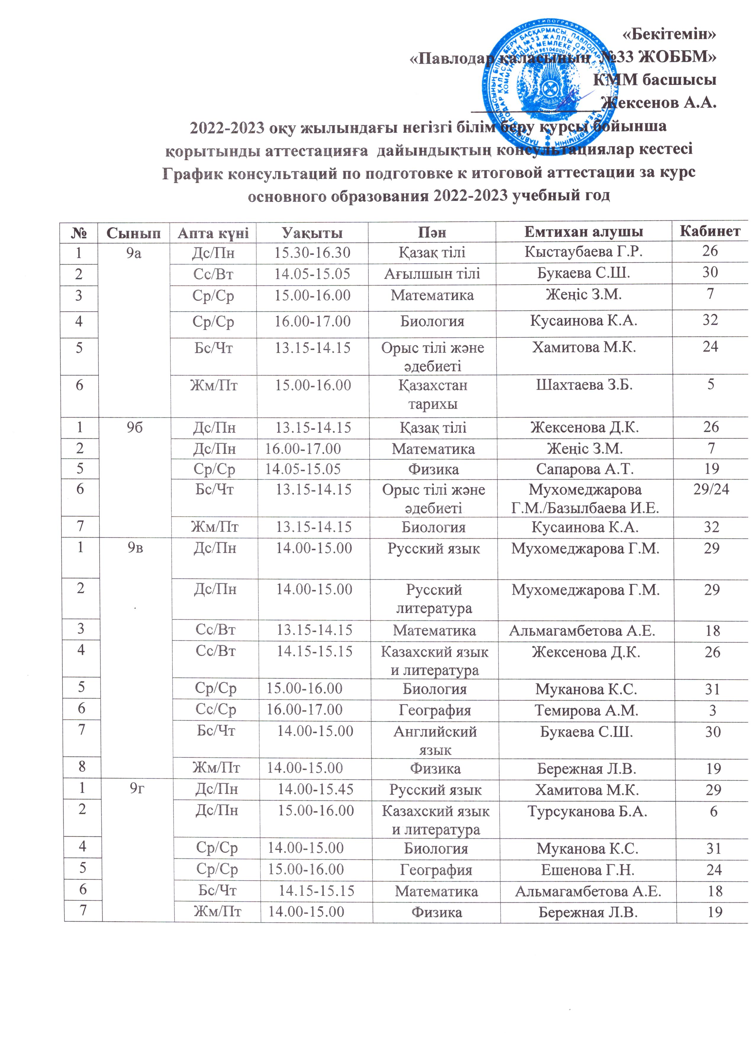 Расписание консультаций для учащихся 9 классов с русским языком обучения по подготовке к итоговой аттестации 2023-2024 учебный год | Скачать Смотреть |