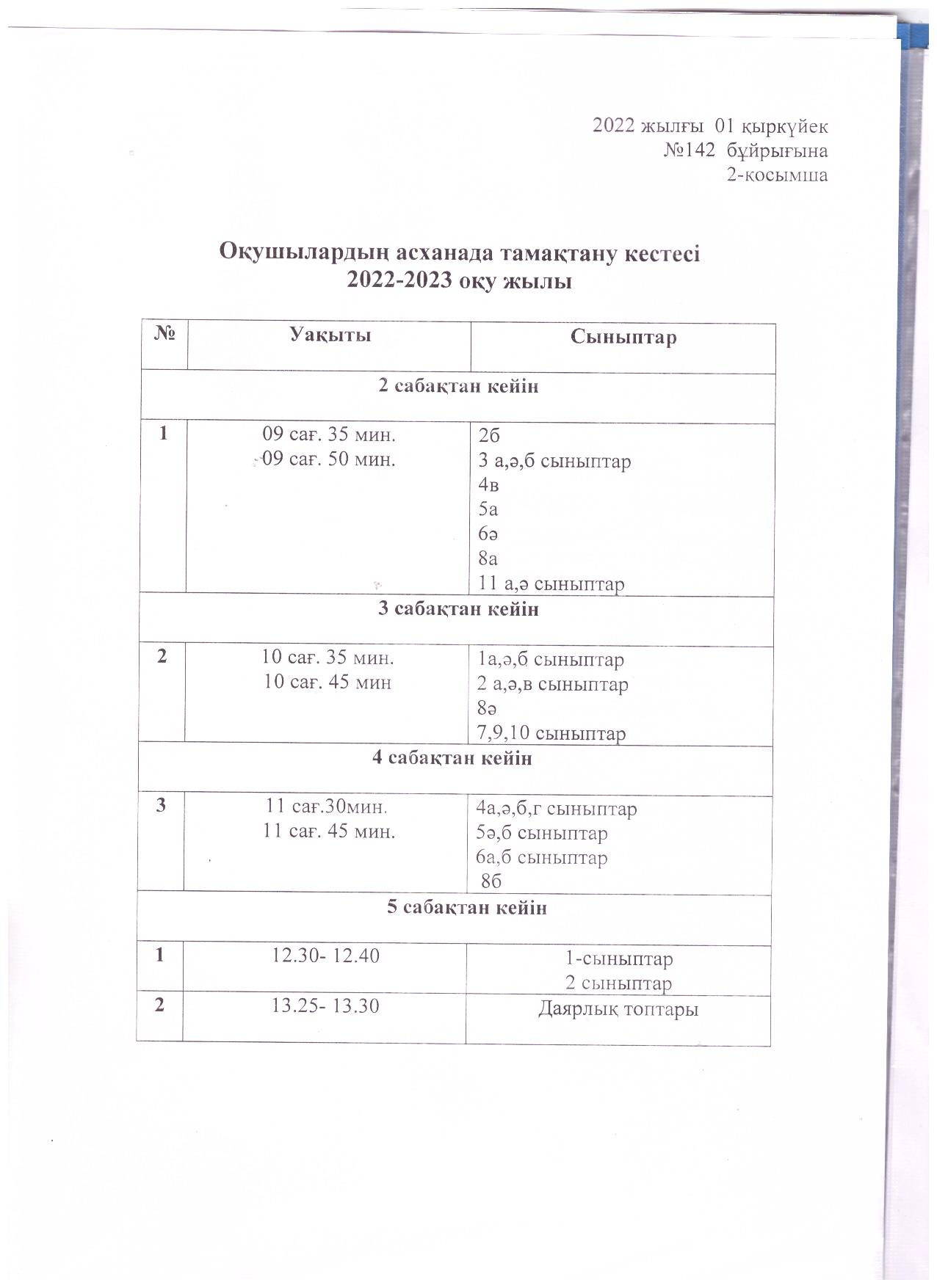 2022-2023 оқу жылына арналған оқушылардың тамақтану кестесі