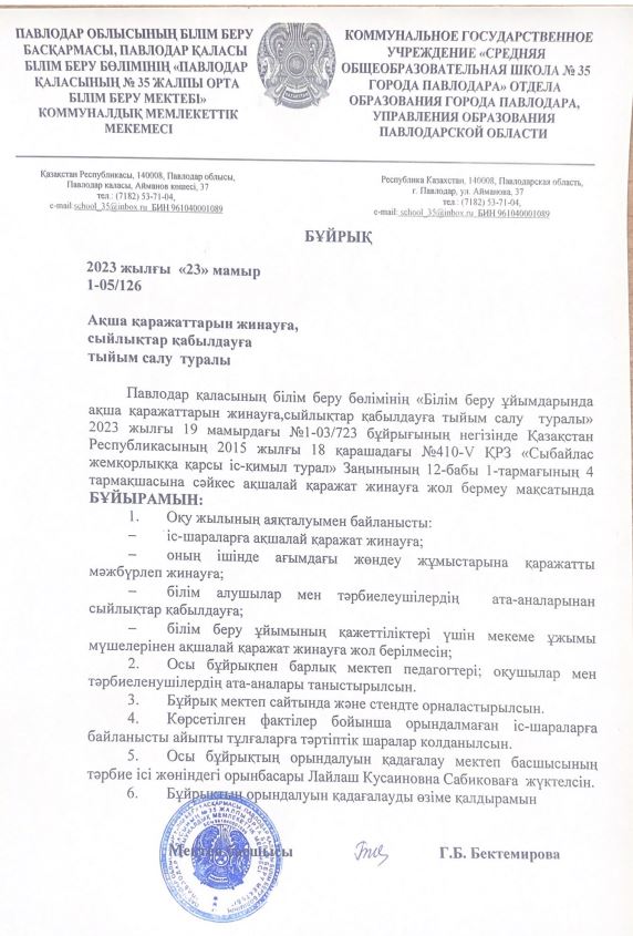 23.05.2023 Бұйрық 1-05/26 Ақша қаражаттар жинауға, сыйлықтар қабылдауға тыйым салу туралы | Скачать |