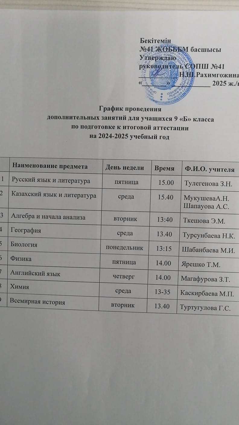 9 Ә сынып оқушыларының қорытынды аттестаттауға дайындық бойынша қосымша сабақ кестесі | Скачать |
