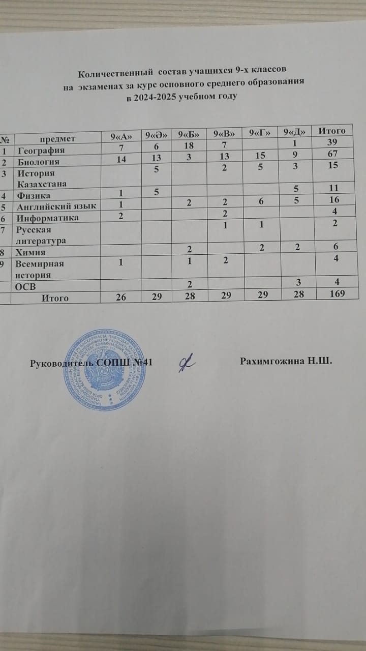 Количество состав учащихся 9х классов на экзаменах за курс основного среднего образования в 2024-2025 уч года
