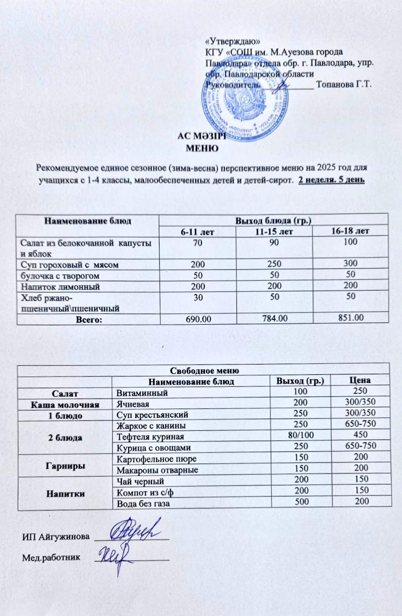 Рекомендуемое единое сезонное (зима-весна) перспективное меню на 2025 год для учащихся с 1-4 классы, малообеспеченных детей и детей-сирот. 2 неделя. 5 день | Скачать |