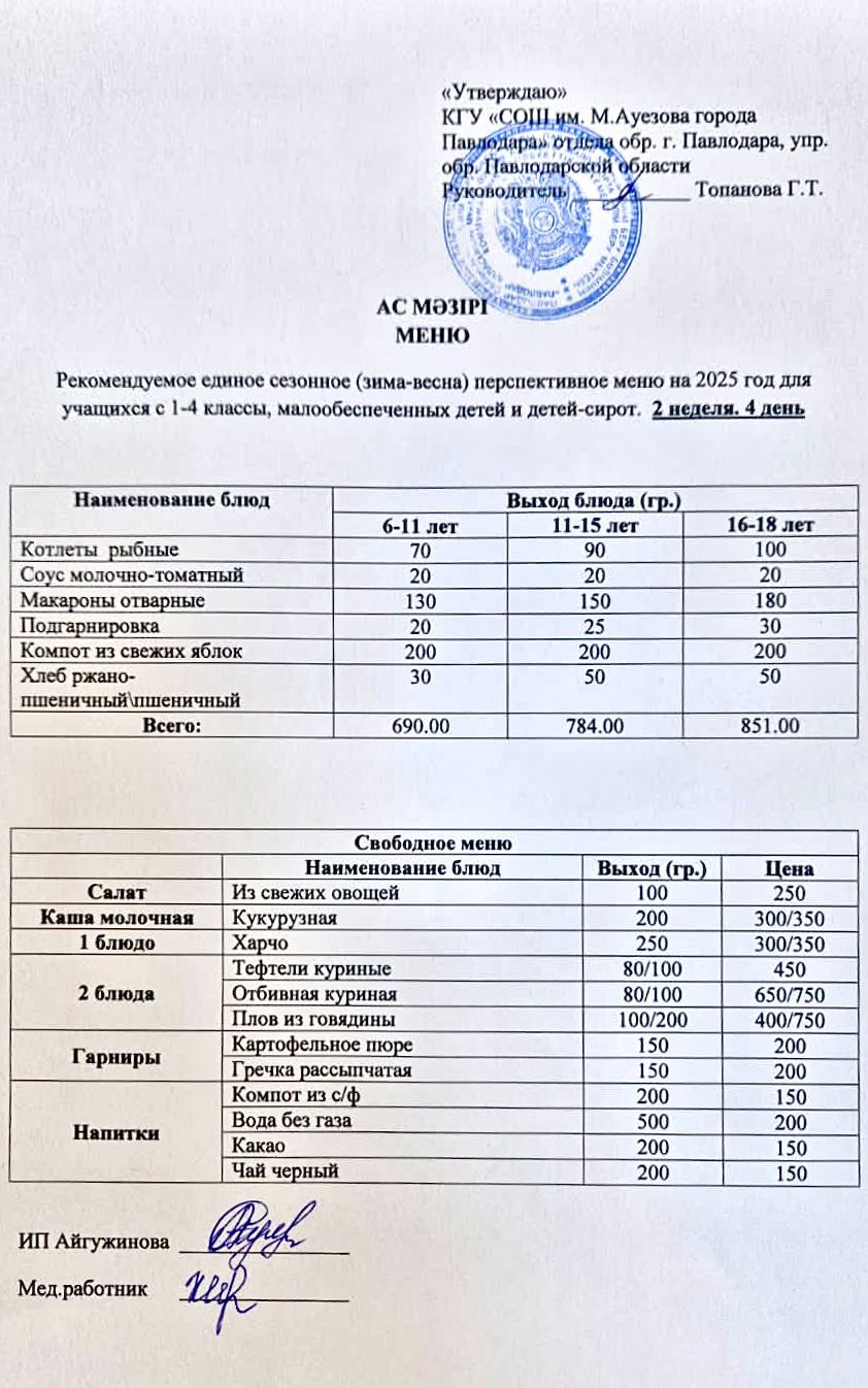 Рекомендуемое единое сезонное (зима-весна) перспективное меню на 2025 год для учащихся с 1-4 классы, малообеспеченных детей и детей-сирот. 2 неделя. 4 день | Скачать |