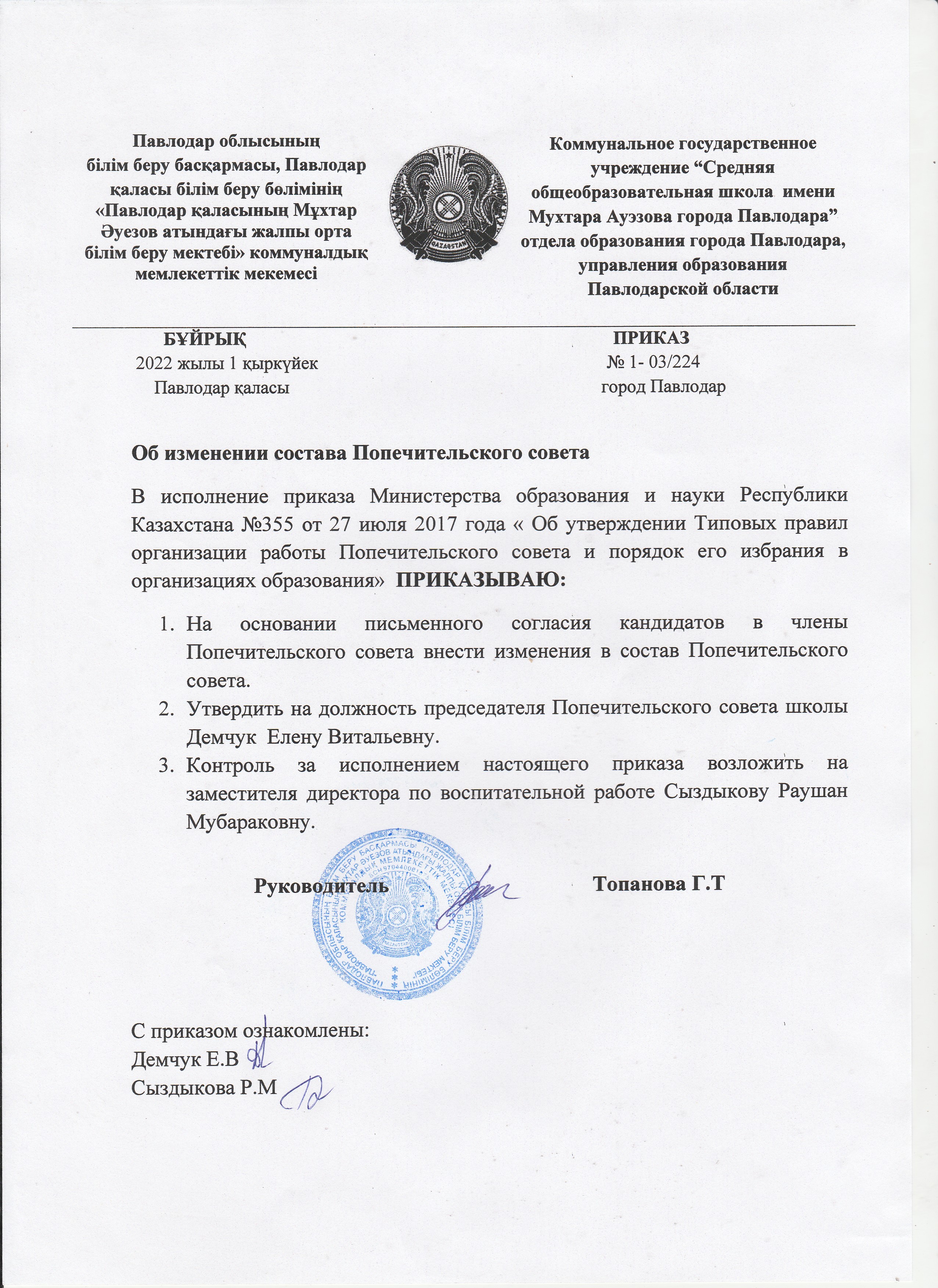 Қамқоршылық кеңестің құрамын өзгерту туралы бұйрық