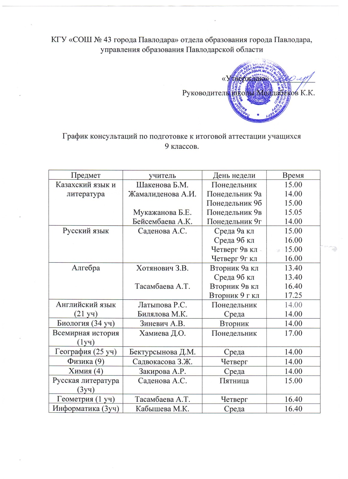 Демалыстарда 9 сынып оқушыларын қорытынды аттестаттауға дайындау бойынша консультациялар кестесі