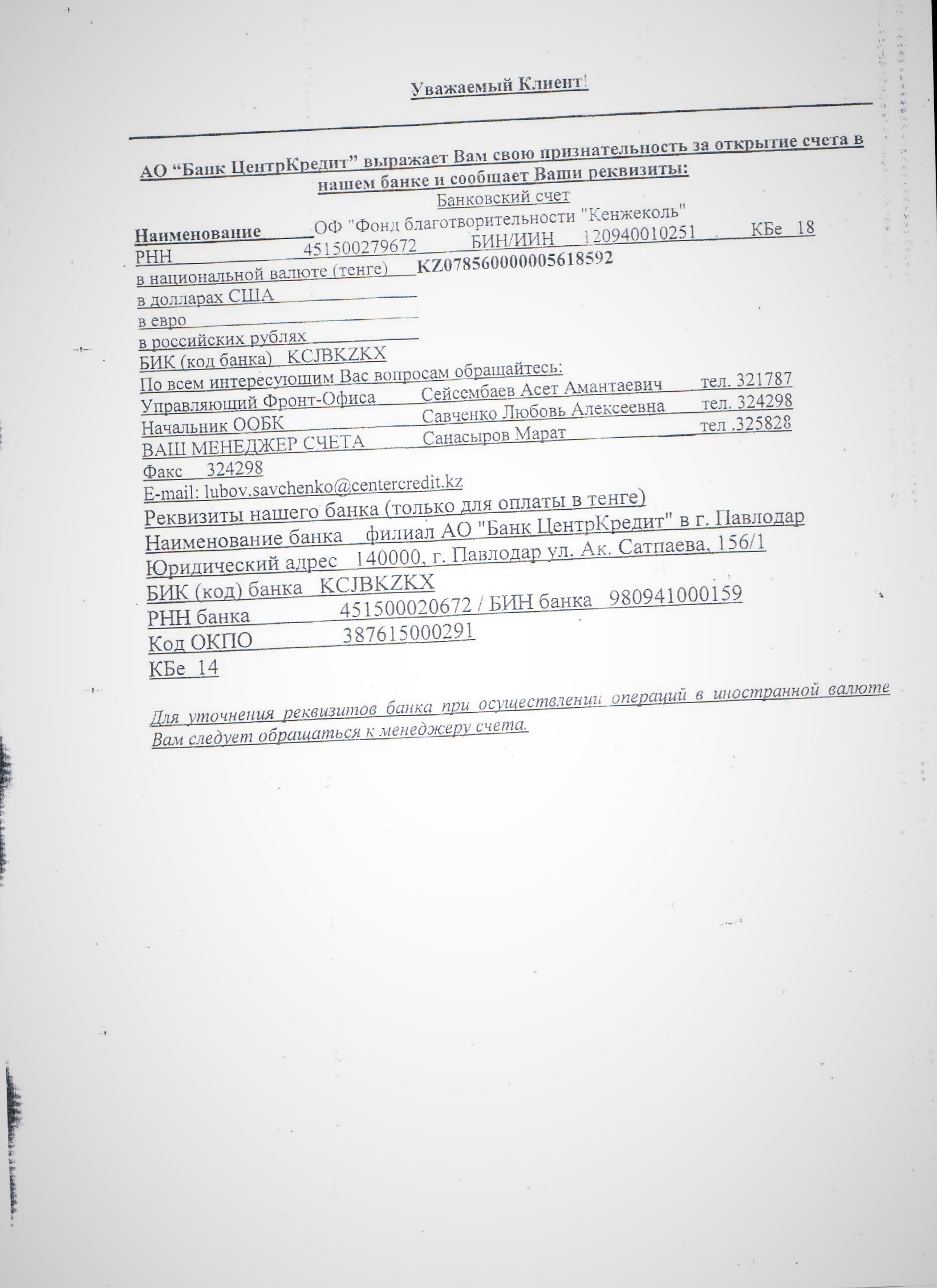 Сведения о банковском счете Попечительского совета