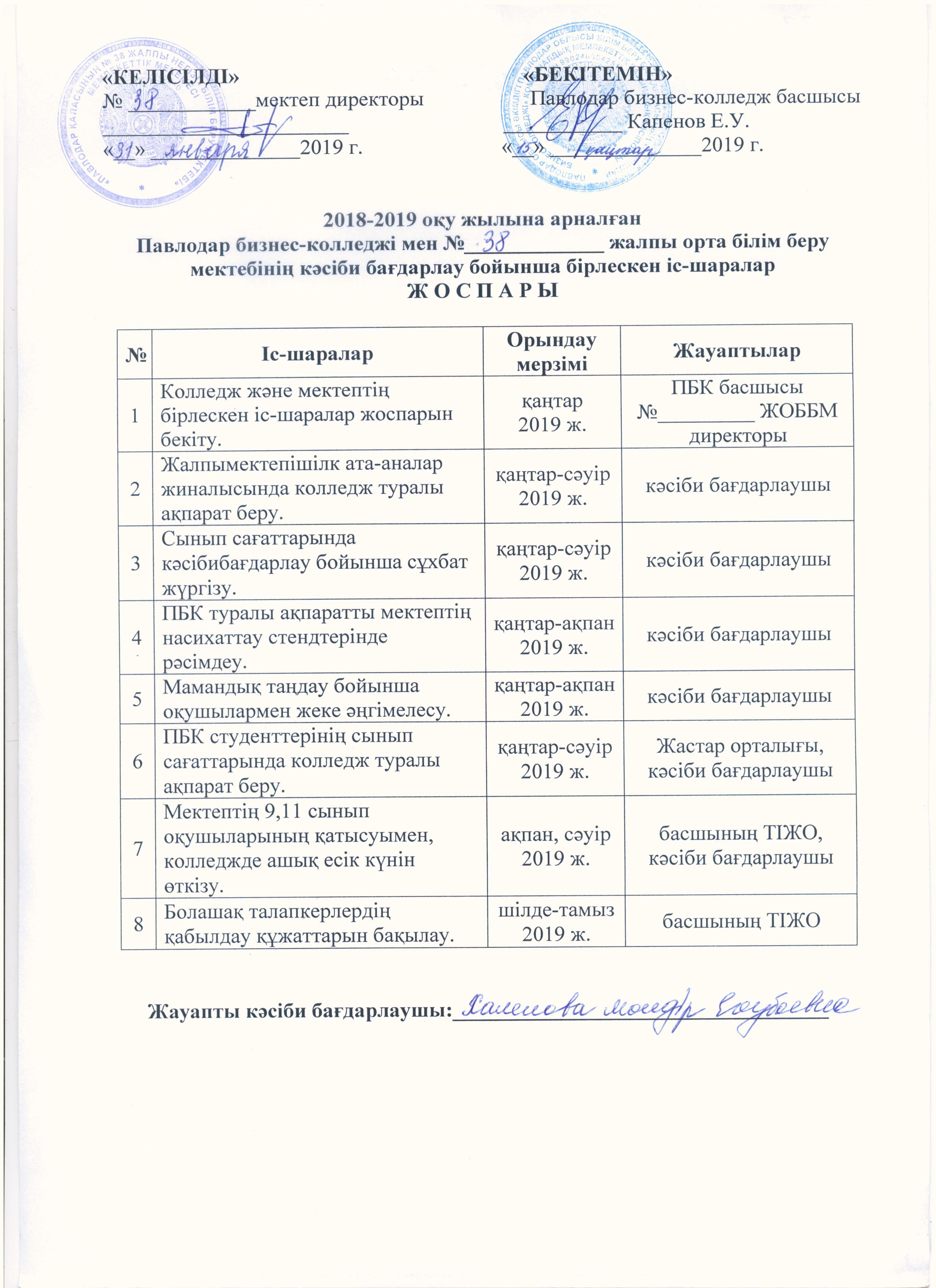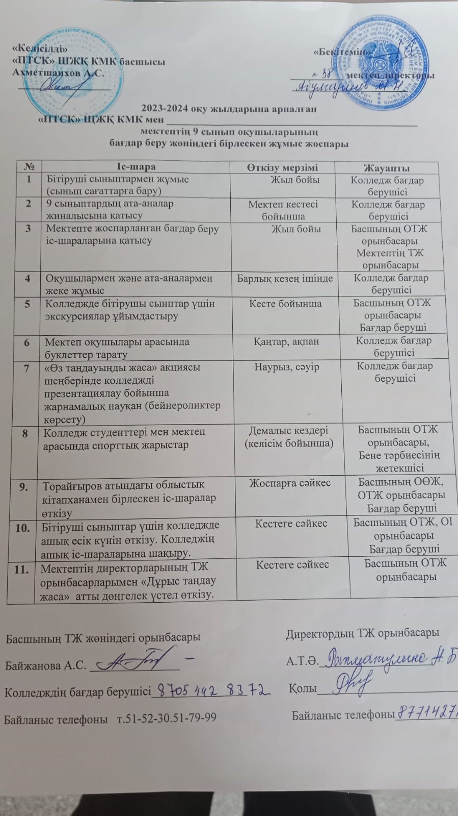 Кәсіптік бағдар беру бойынша жұмыс жоспары