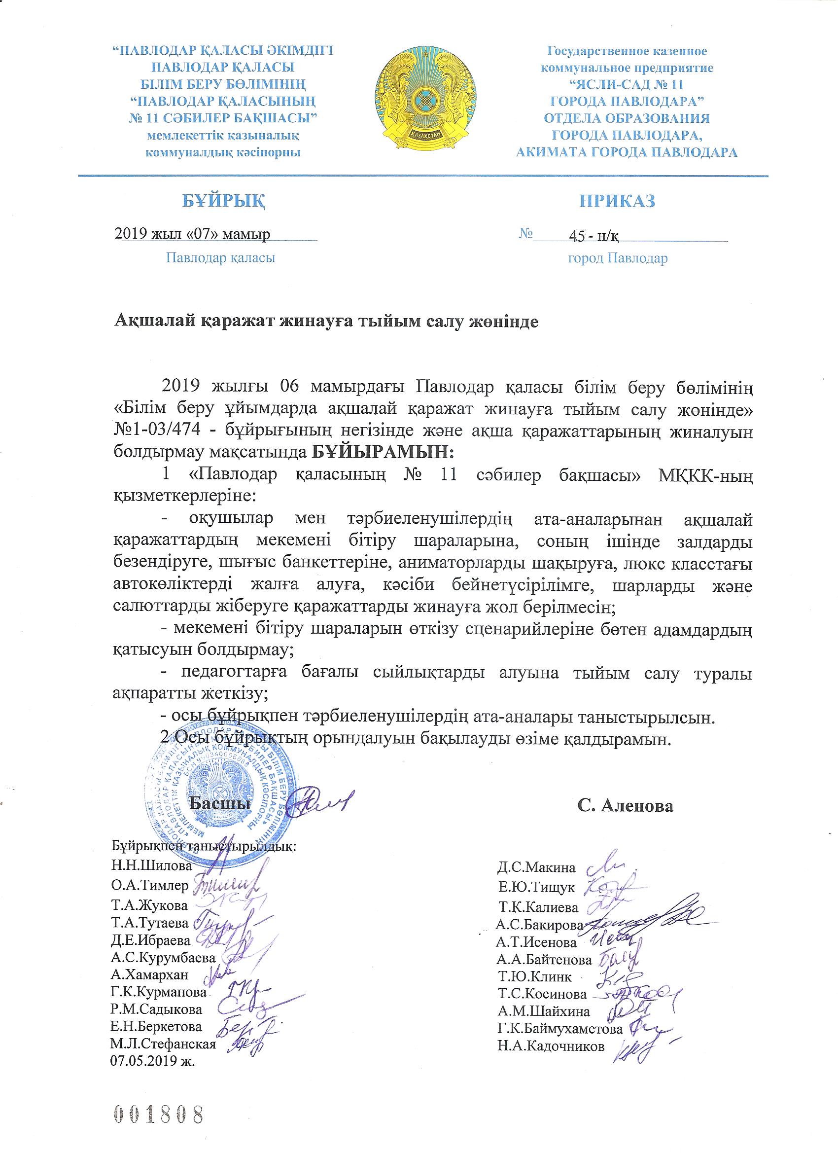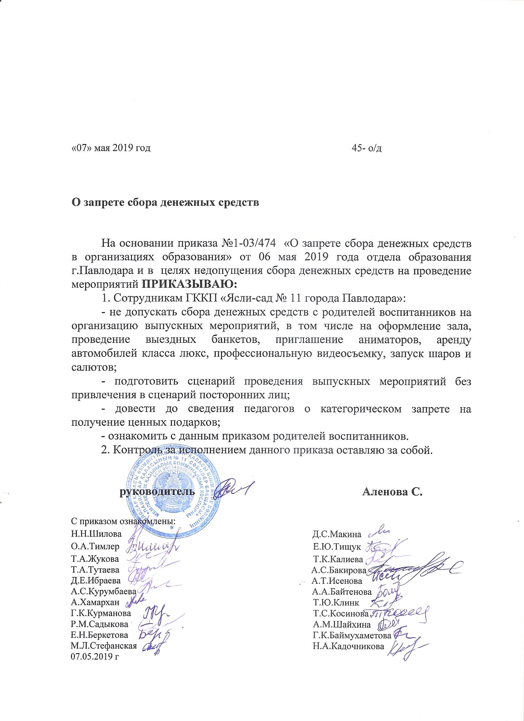 Приказ о сборе денег | Скачать |