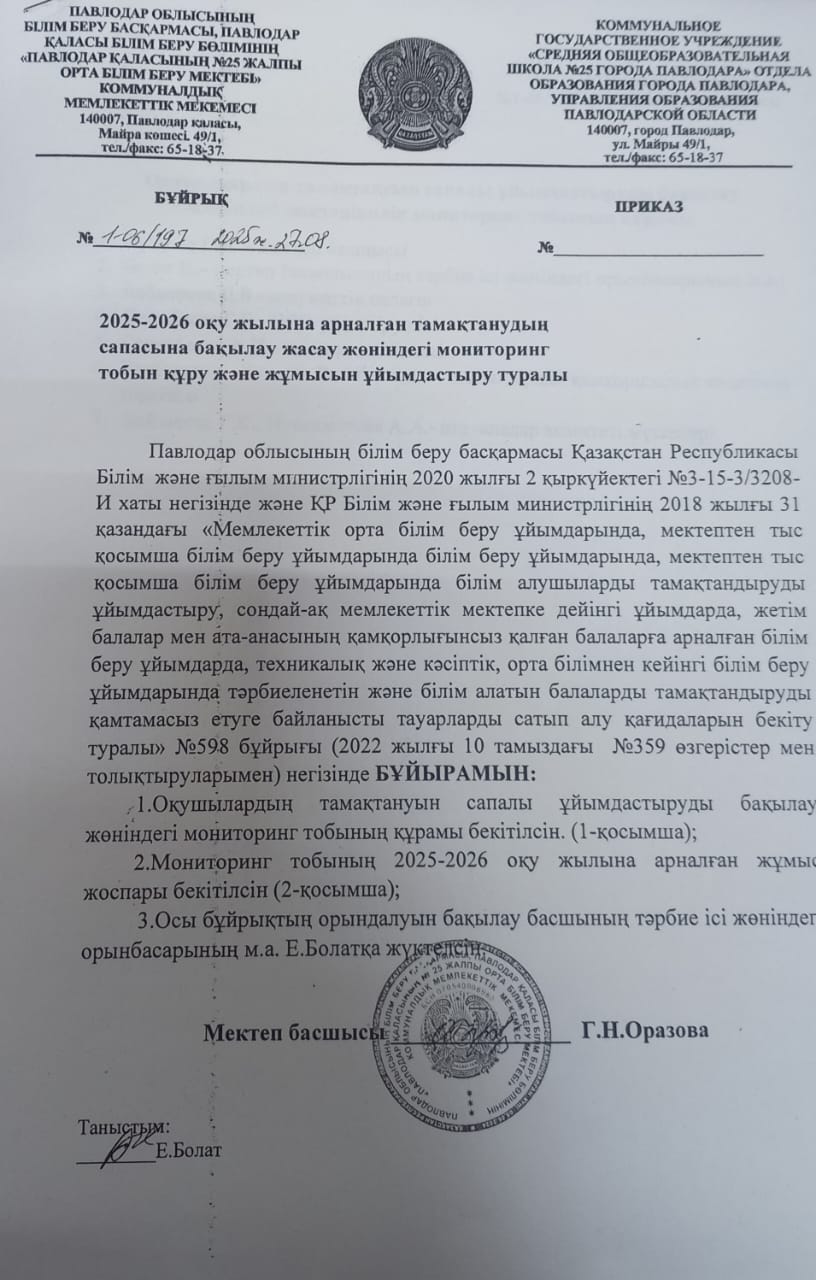 Приказ о проведении мониторинга качества организации школьного питания в 2025-2026 учебном году | Скачать |