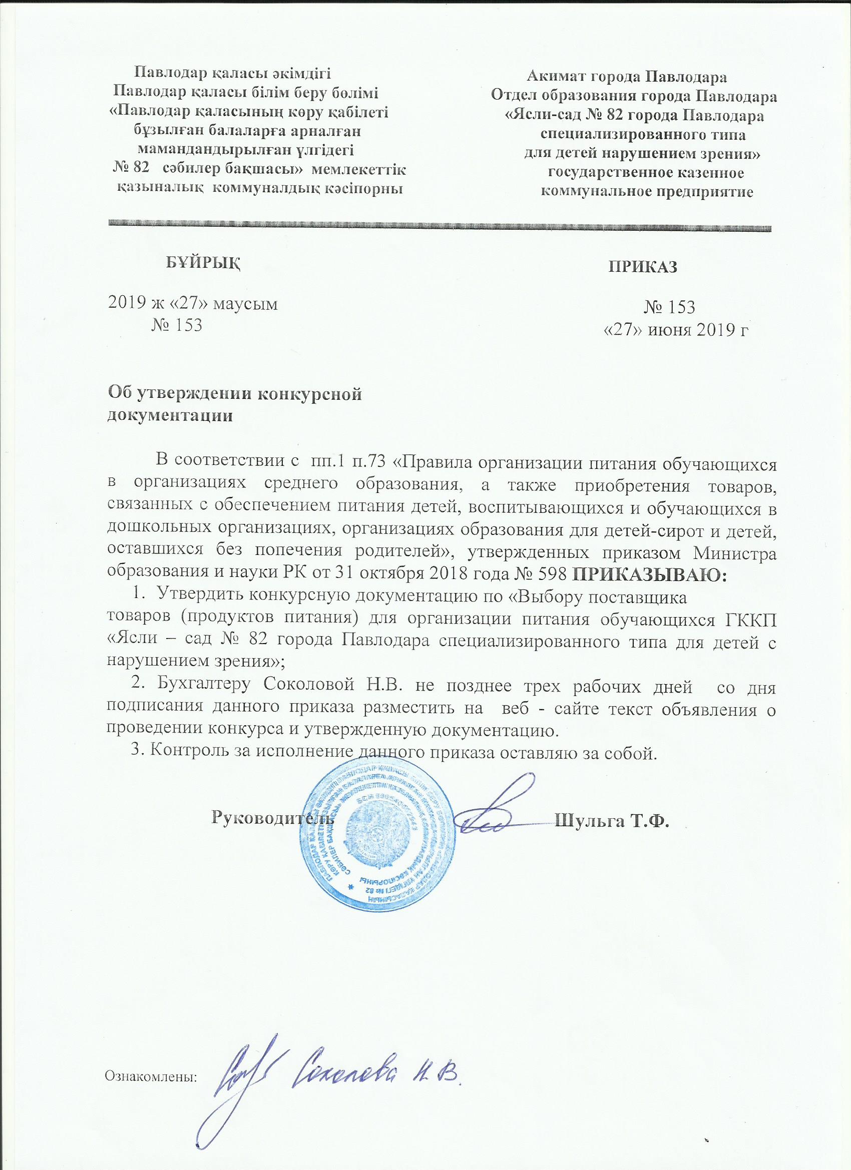 Приказ об утверждении конкурсной документации 28.06.19 | көшіріп алу |