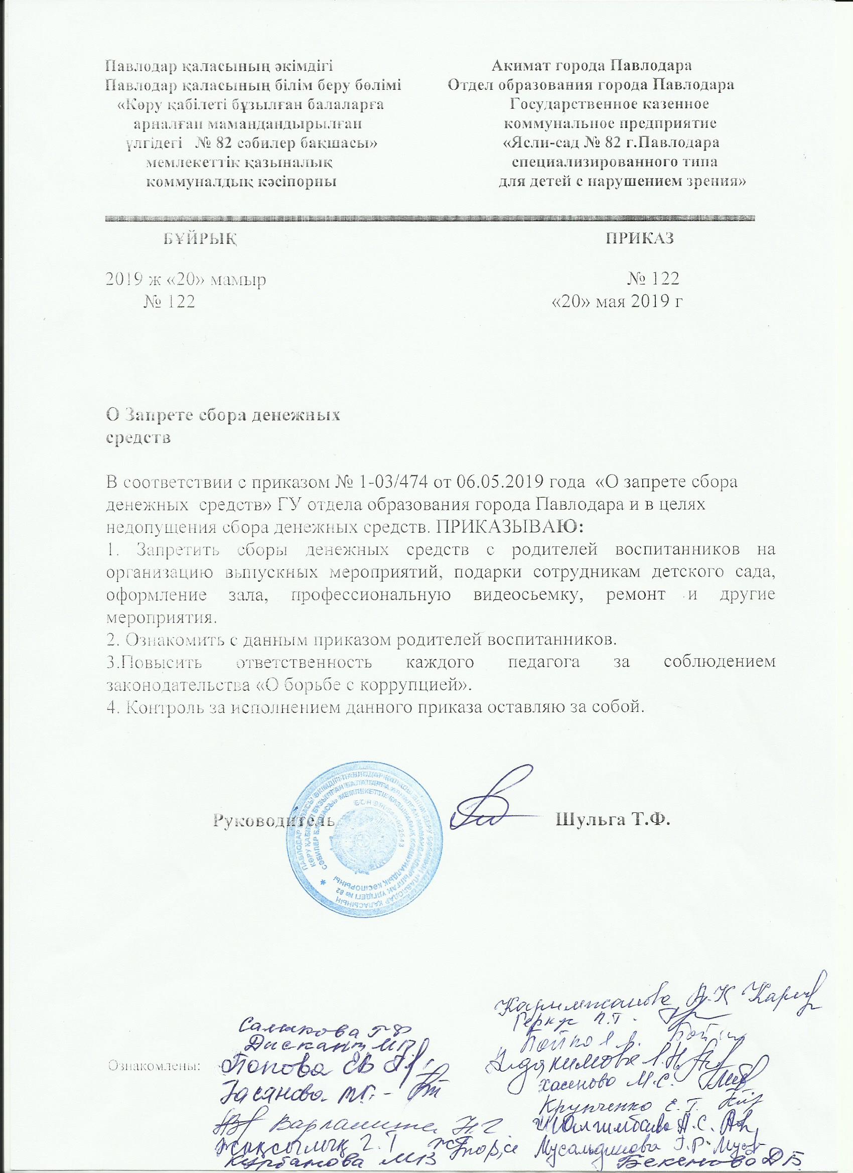 Приказ ГККП "Ясли-сад №82 г.Павлодара специализированного типа для детей с нарушением зрения" О Запрете сбора денежных средств | Скачать |