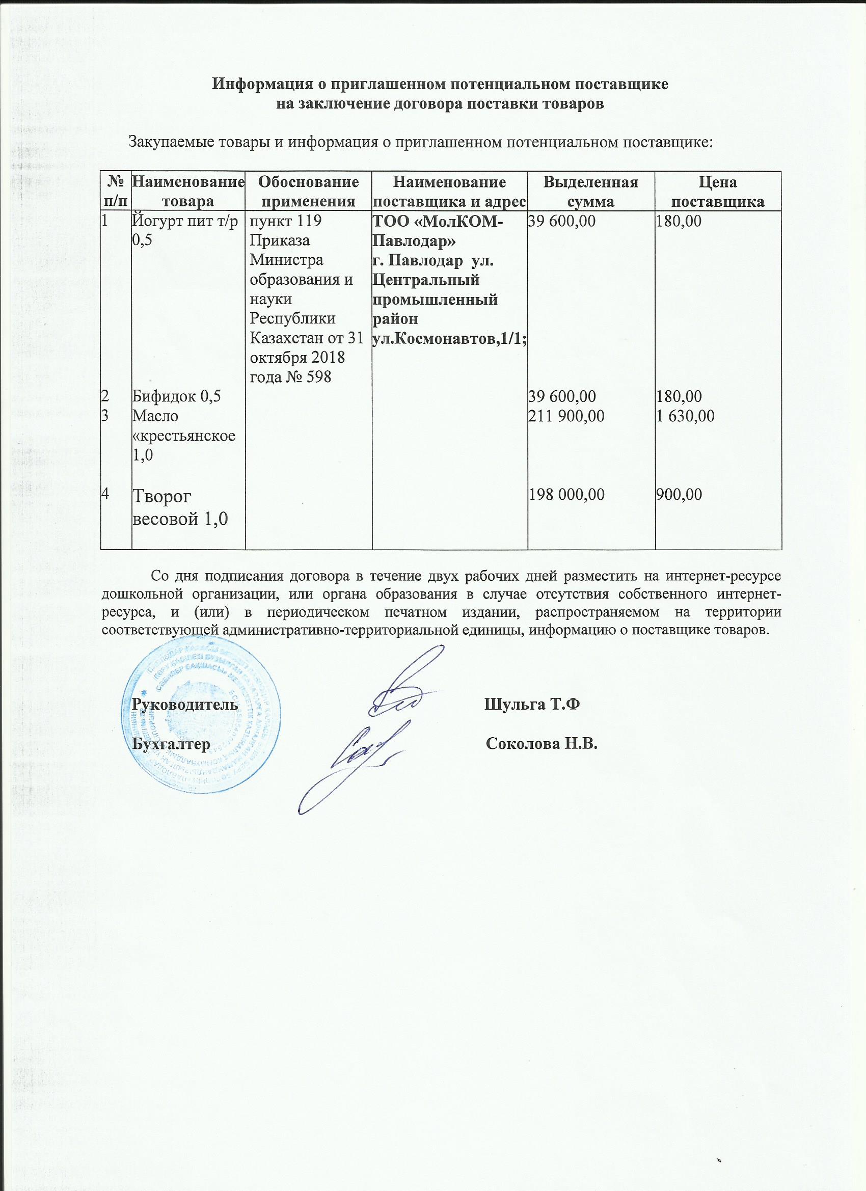 Информация о приглашенном поставщике кисло-молочной продукции 02.07.19 | көшіріп алу |