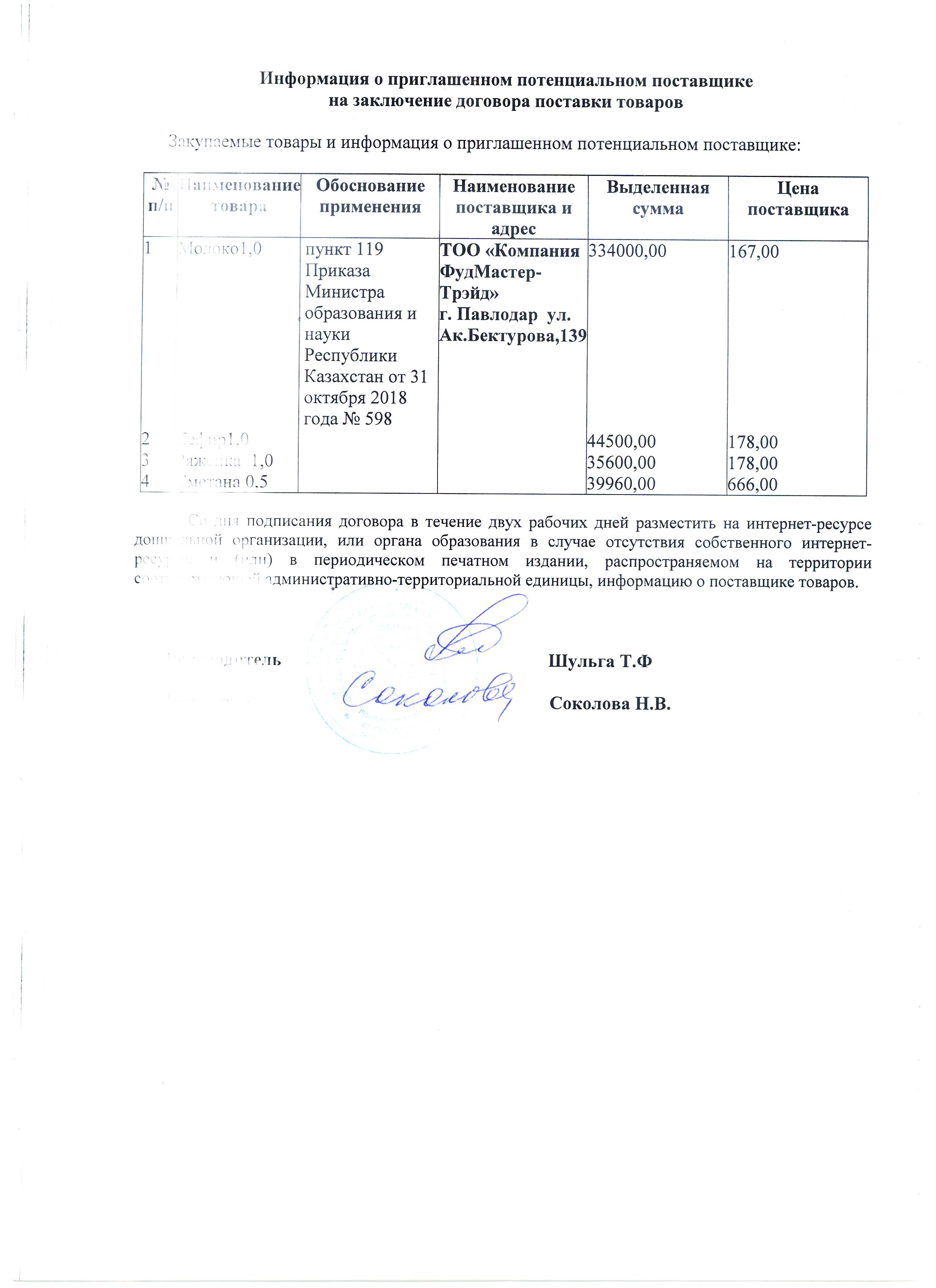 Информация о приглашенном поставщике ТОО "Компания ФудМастер-Трейд" 2 кв. 2020
