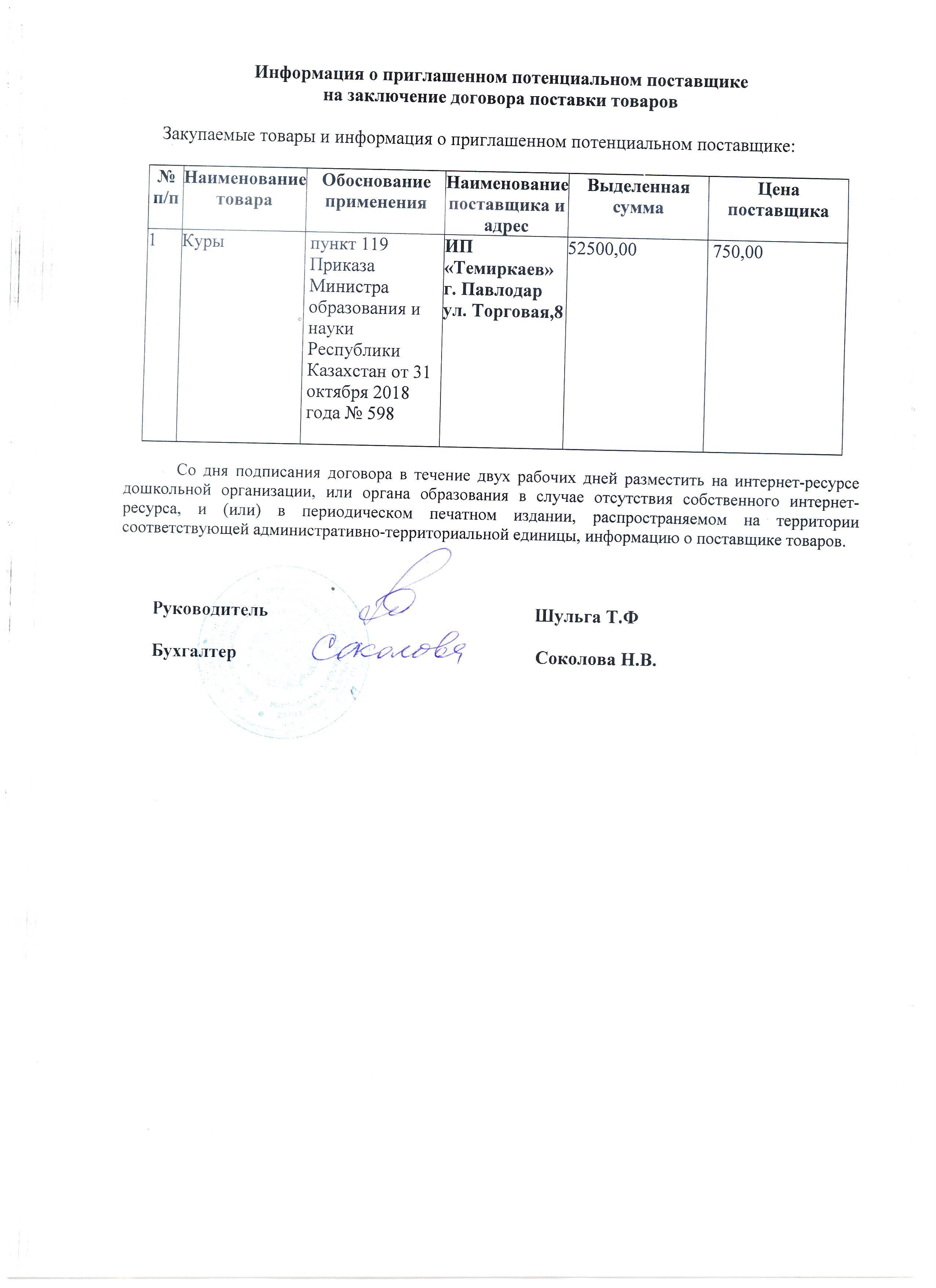Информация о приглашенном поставщике ИП "Темиркаев" на 2 кв. 2020