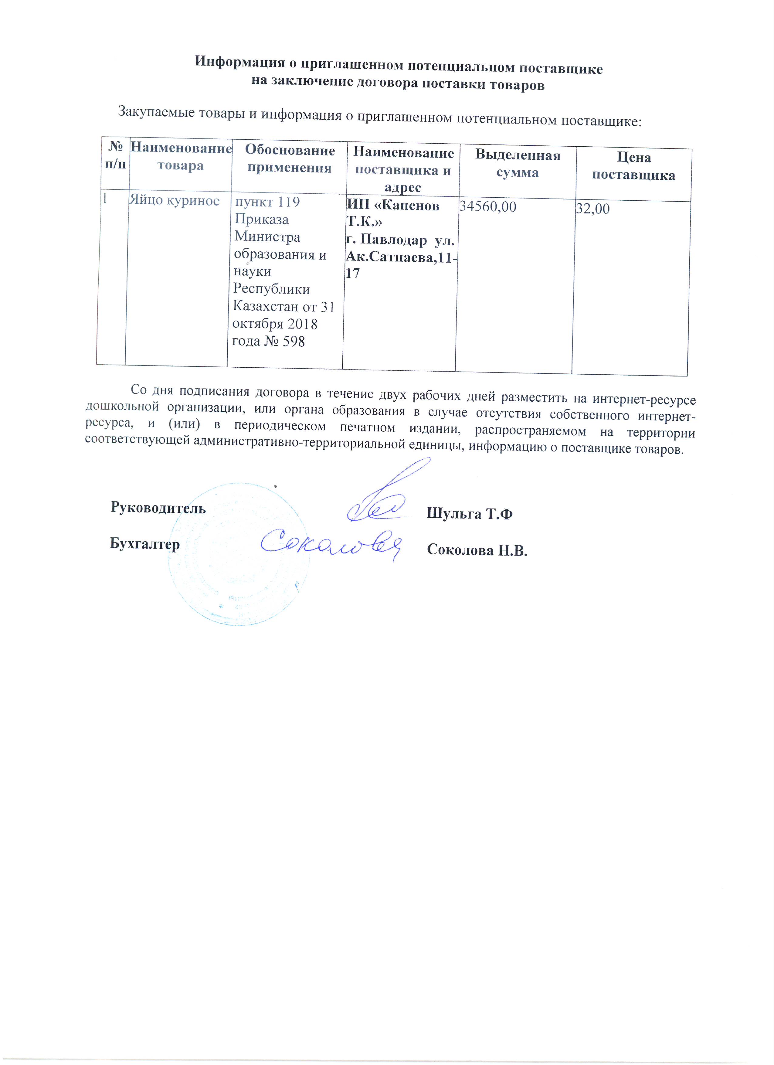 Информация о приглашенном поставщике ИП "Капенов Т.К." на 2 кв. 2020