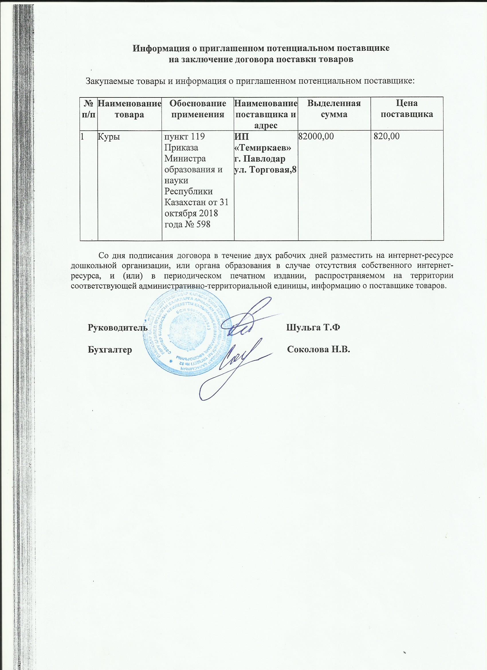 Информация о приглашенном поставщике ТОО Группа Интер 05.11.2019