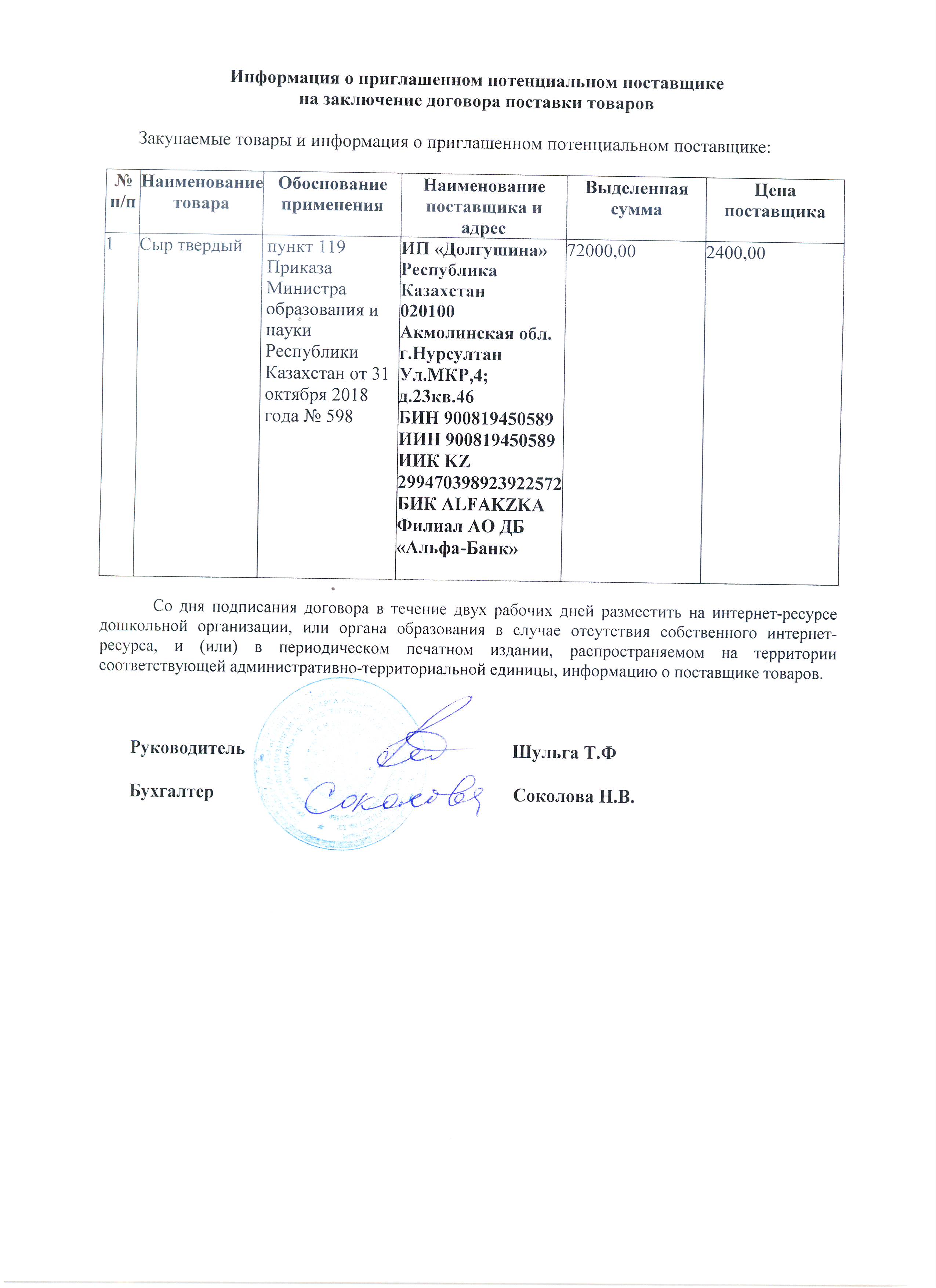Информация о приглашенном поставщике ИП "Долгушина" на 2 кв. 2020