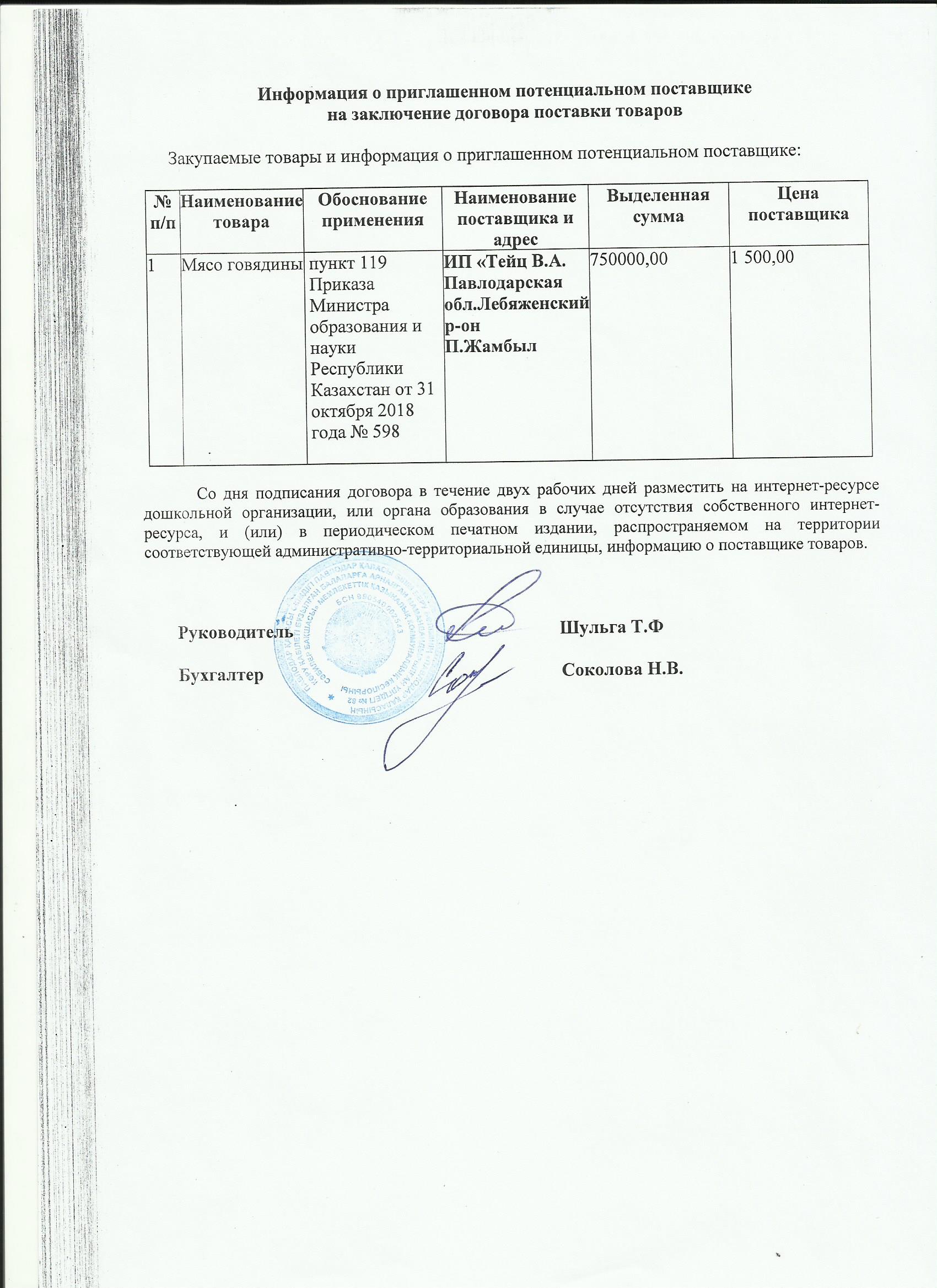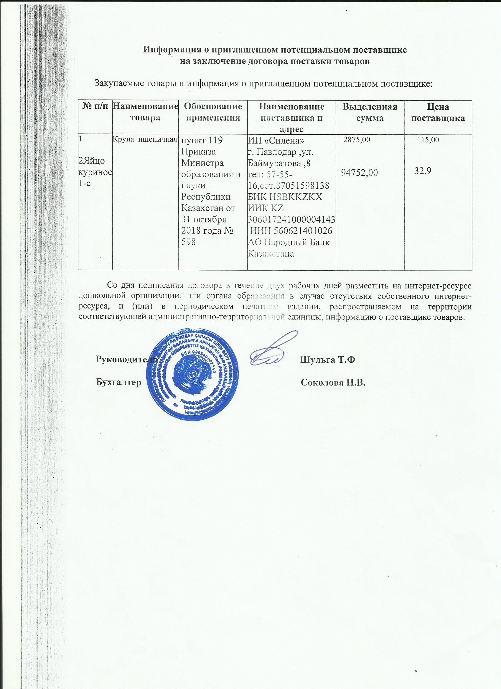Информация о приглашенном поставщике ИП Силена 1 кв 2020 (яйцо, крупа пш)