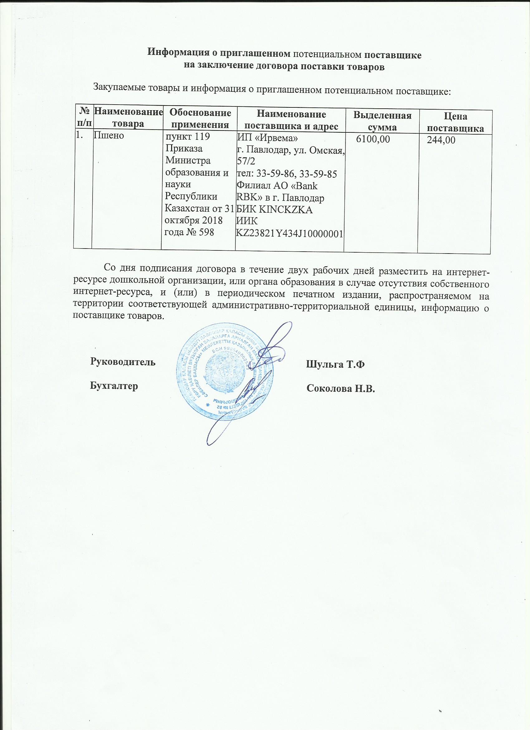 Информация о приглашенном поставщике ИП Ирвема (пшено) 13.11.2019