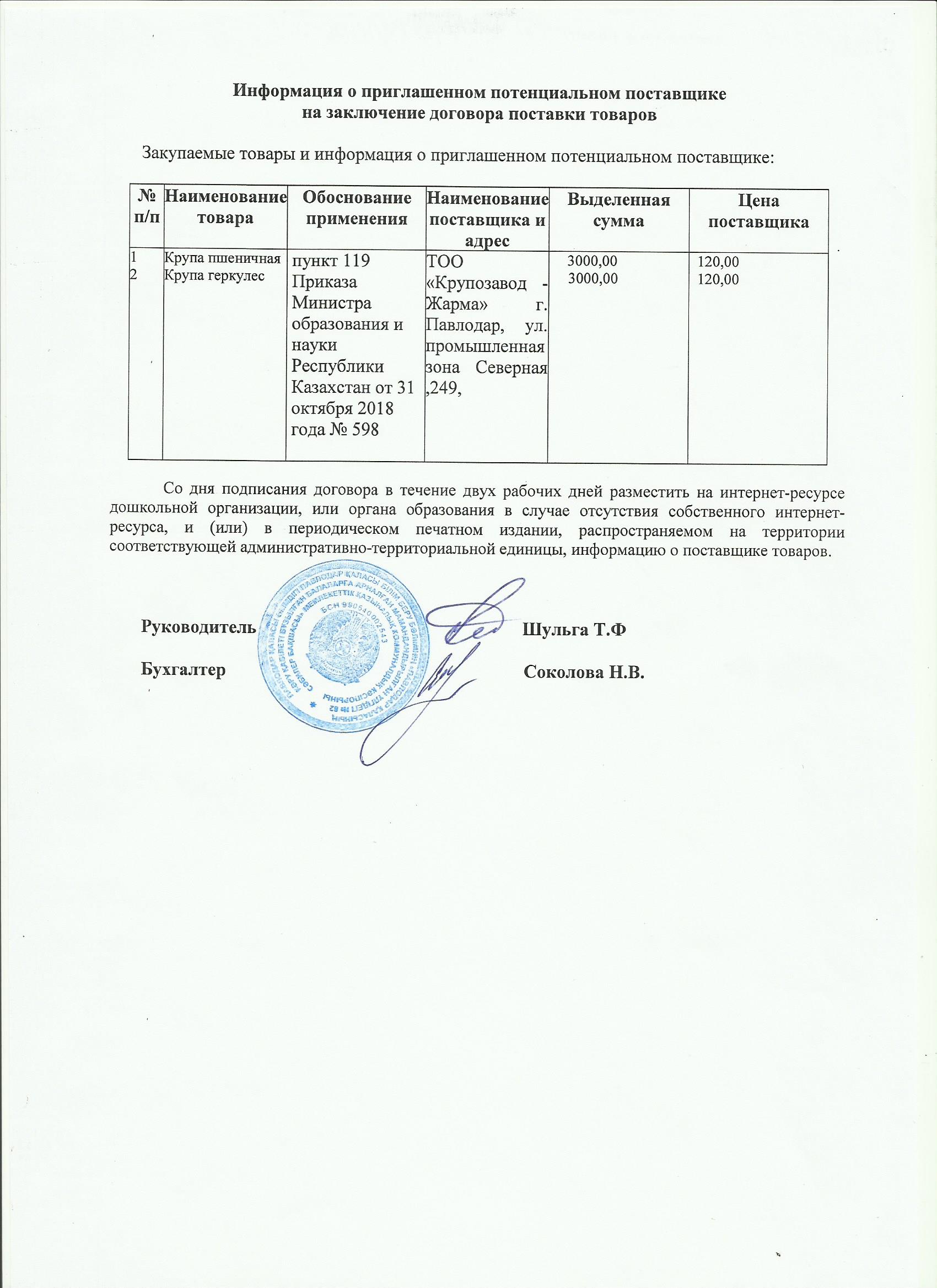 Информация о приглашенном поставщике ТОО Крупзавод Жарма 13.11.2019