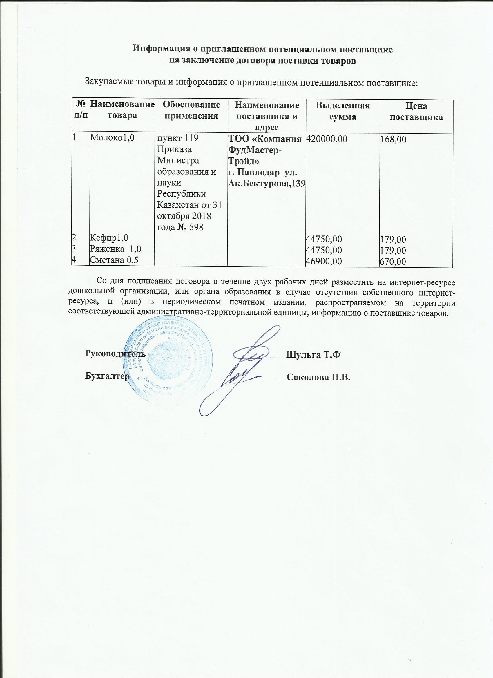 Информация о приглашенном поставщике ТОО МолКомПавлодар 1 кв 2020