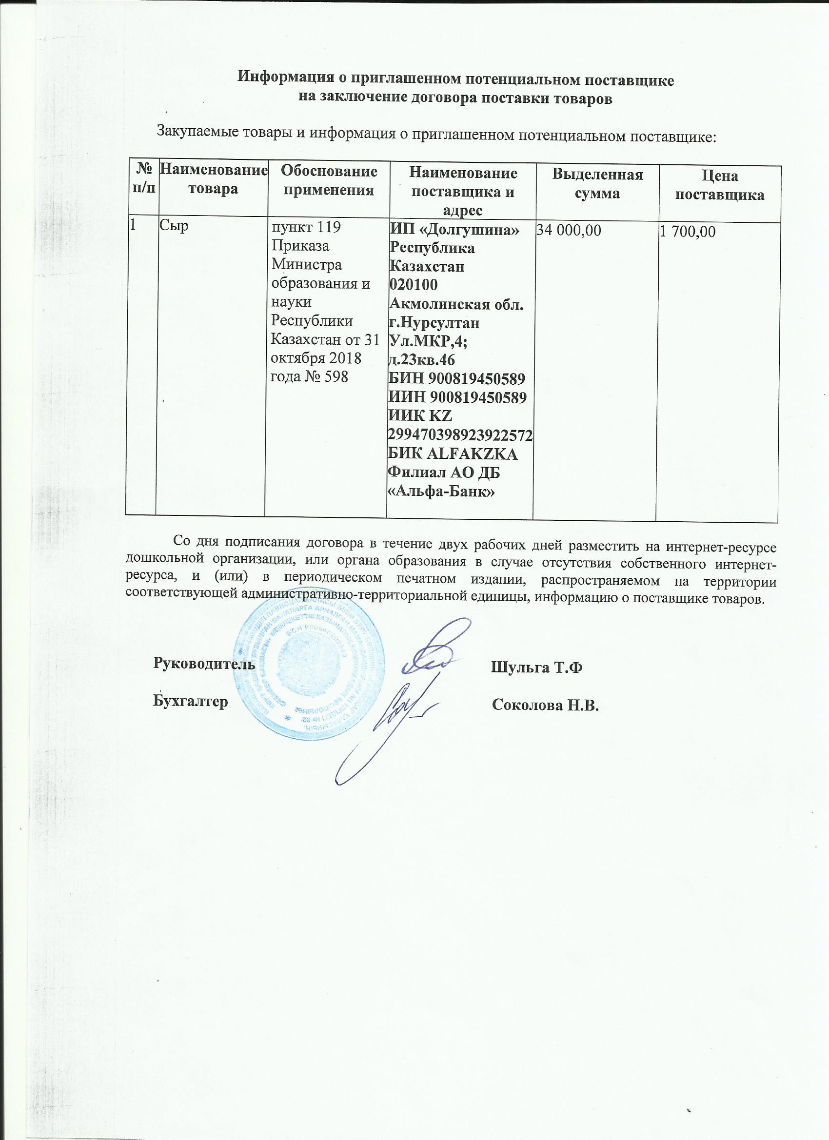 Информация о приглашенном поставщике ТОО Группа Интер 05.11.2019 | Скачать |
