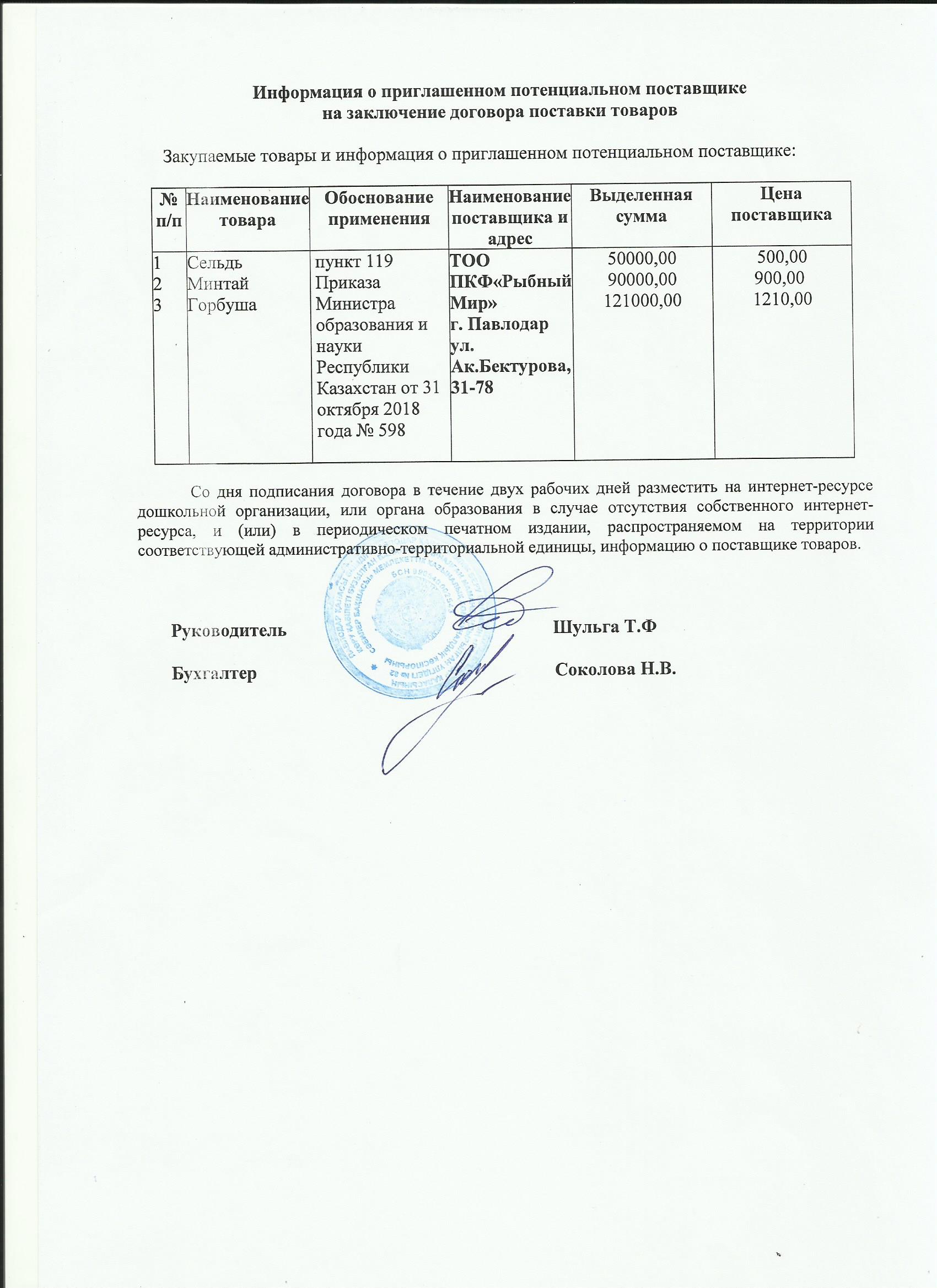 Информация о приглашенном поставщике ТОО ПКФ Рыбный Мир 1 кв 2020 | Скачать |
