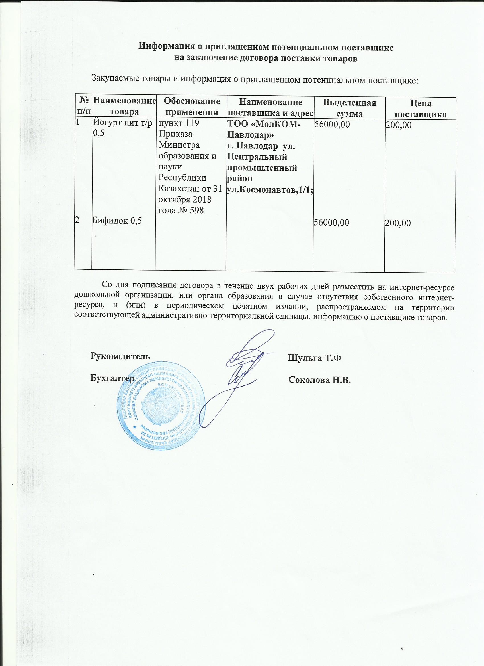 Информация о приглашенном поставщике ТОО МолКомПавлодар 05.11.2019