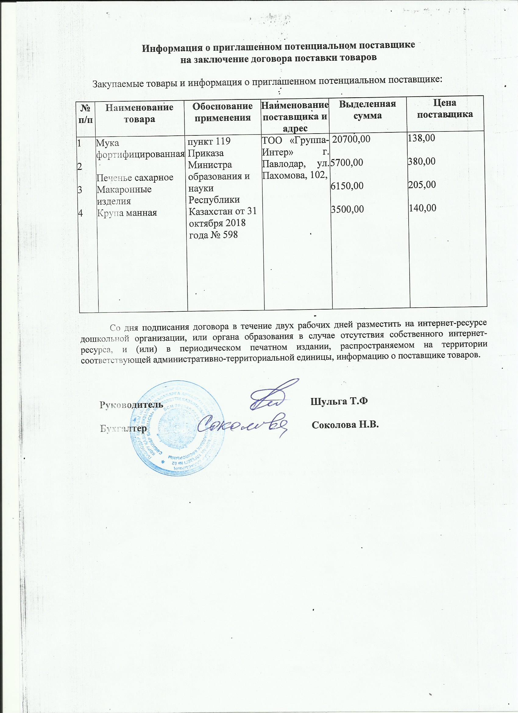 Информация о приглашенном поставщике ТОО Группа Интер 2 кв 2020