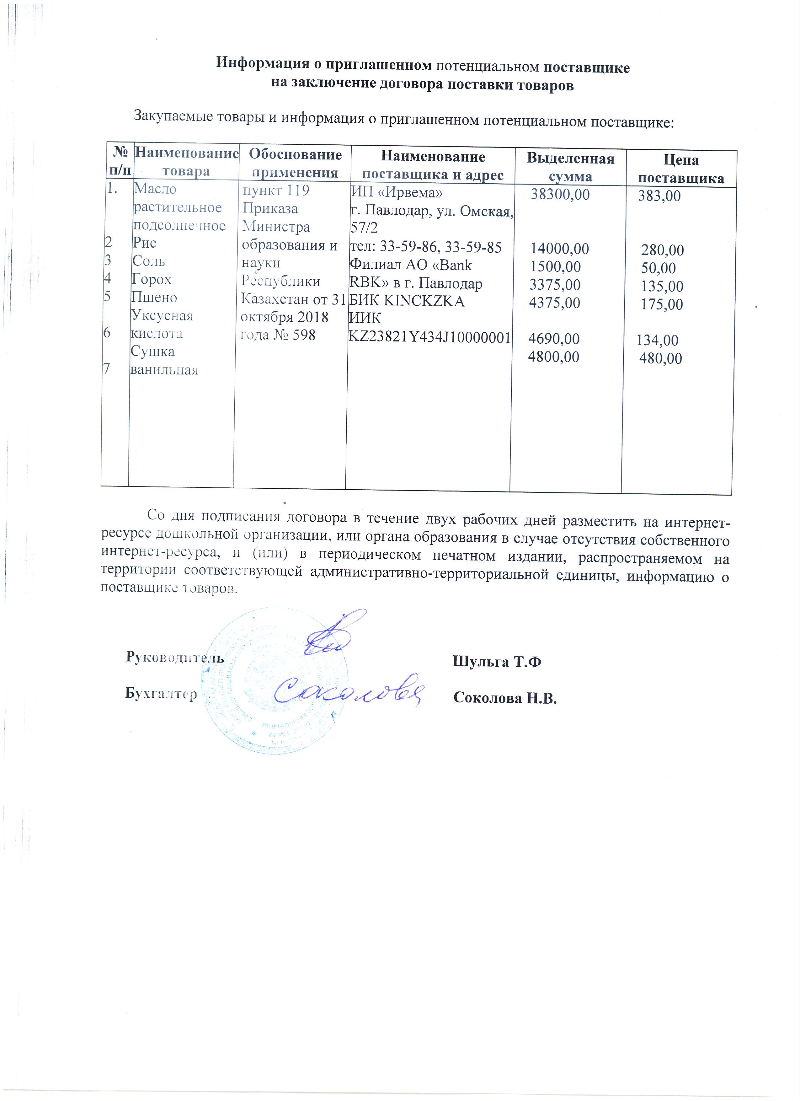 Информация о приглашенном поставщике ИП "Силена" на 2 кв. 2020