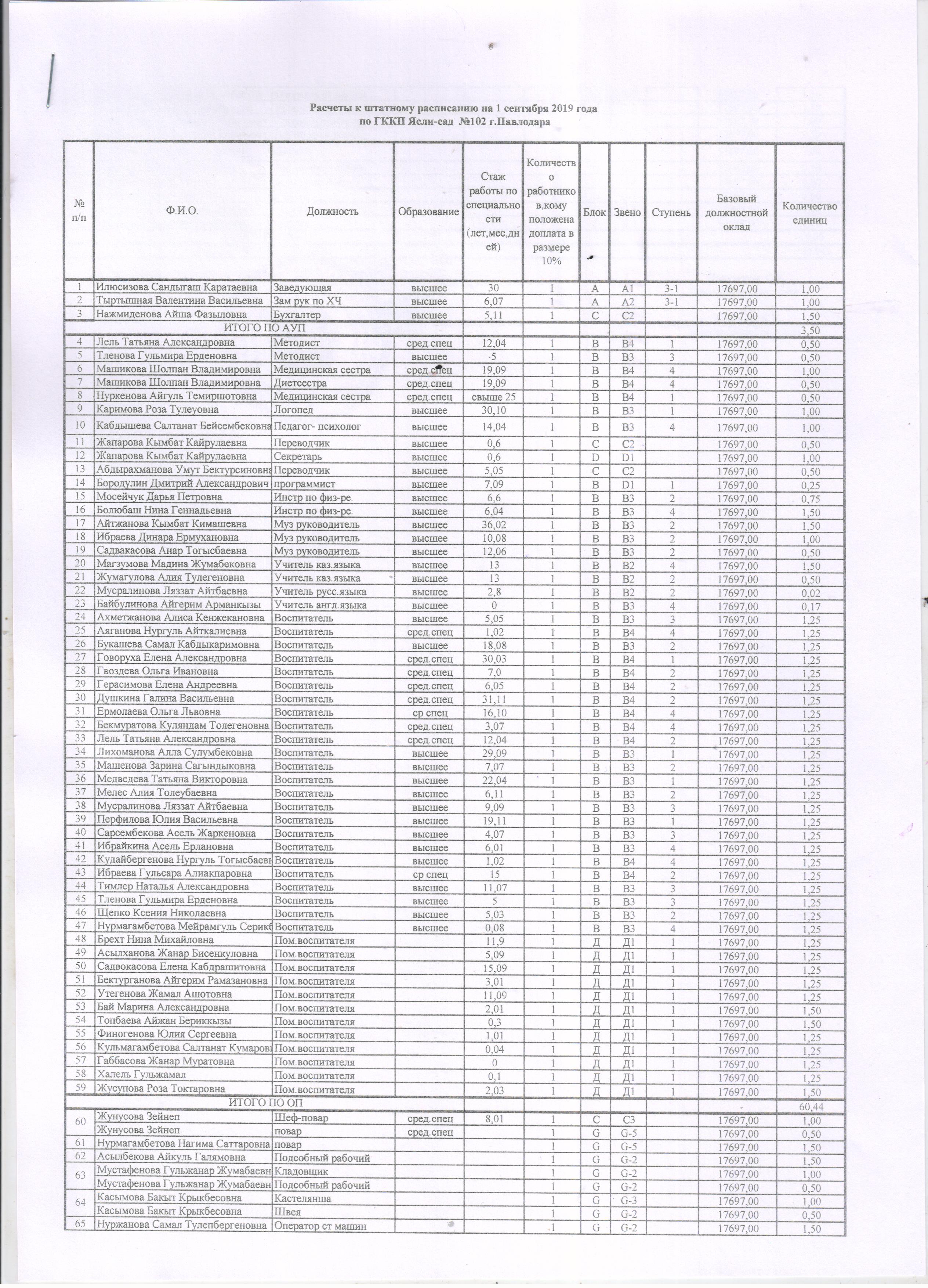 Расчеты к штатному расписанию на 1 сентября 2019 г