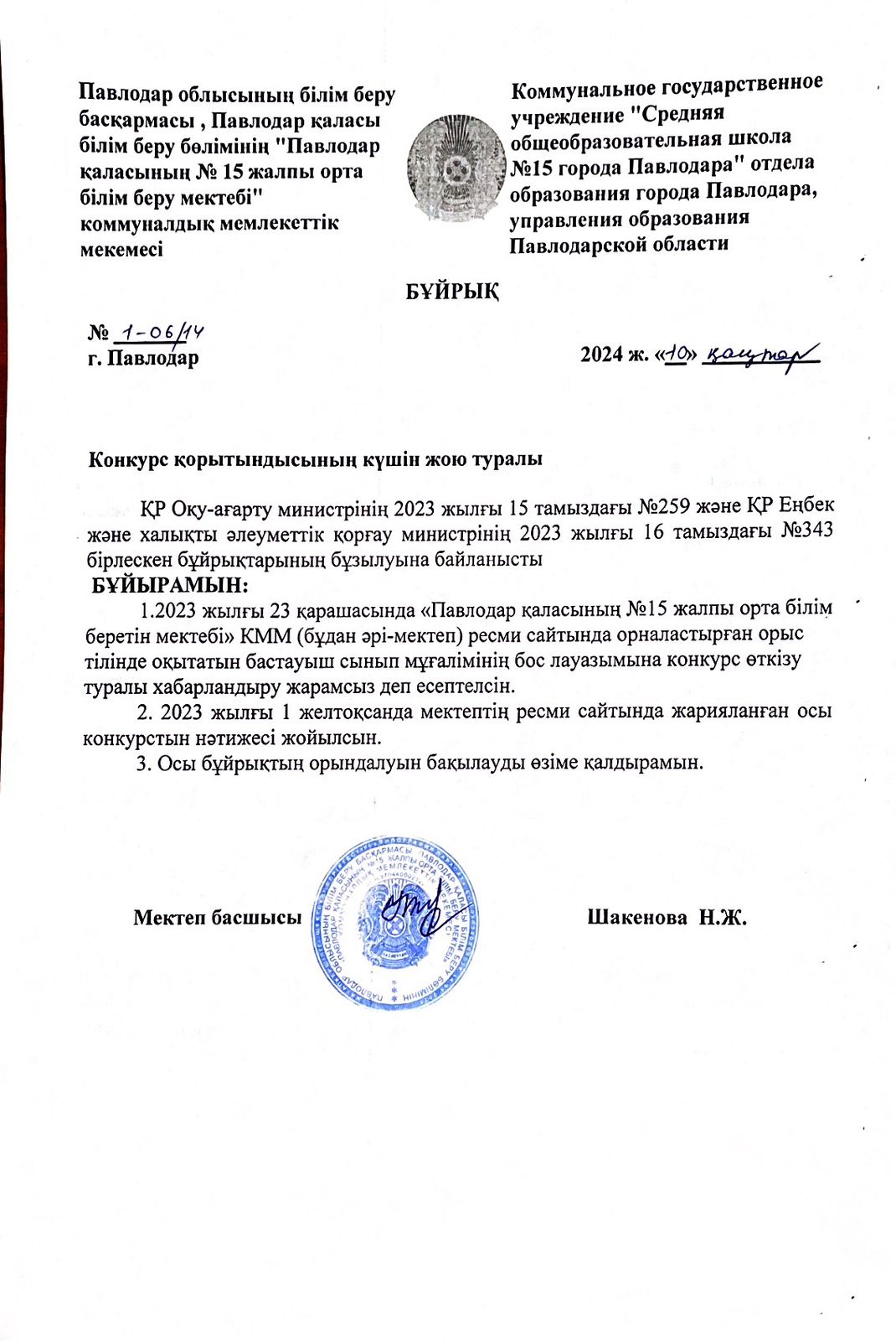 Приказ КГУ "СОШ №15 города Павлодара" об аннулировании итогов конкурса на вакантную должность учителя начальных классов с русским языком обучения