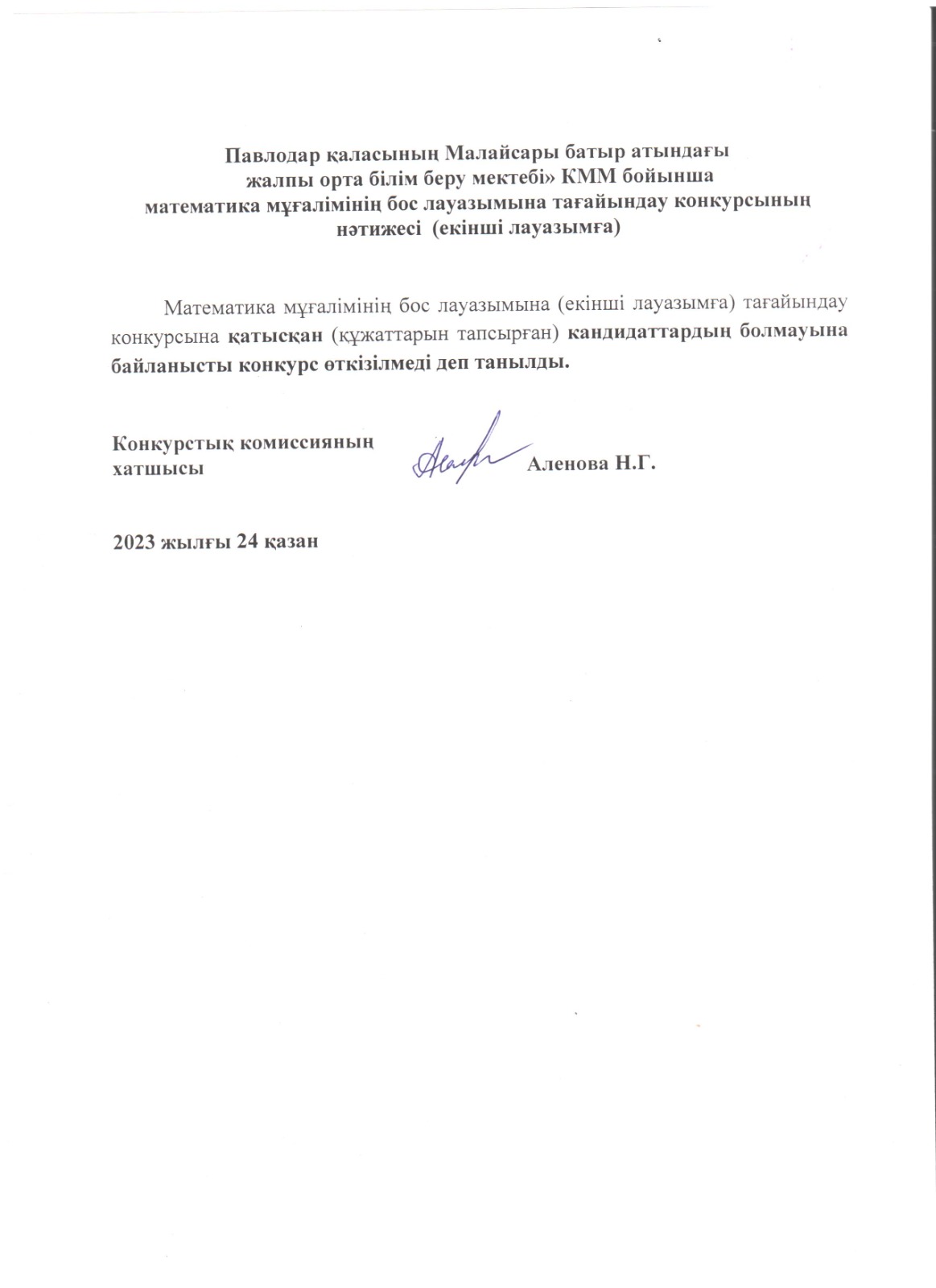 «Павлодар қаласының Бауыржан Момышұлы атындағы жалпы орта білім беру мектебі» КММ бойынша математика мұғалімі бос лауазымына тағайындау конкурсының нәтижесі. | Скачать |