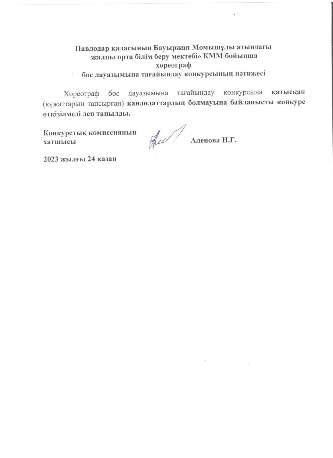 «Павлодар қаласының Бауыржан Момышұлы атындағы жалпы орта білім беру мектебі» КММ бойынша хореограф бос лауазымына тағайындау конкурсының нәтижесі. | Скачать |