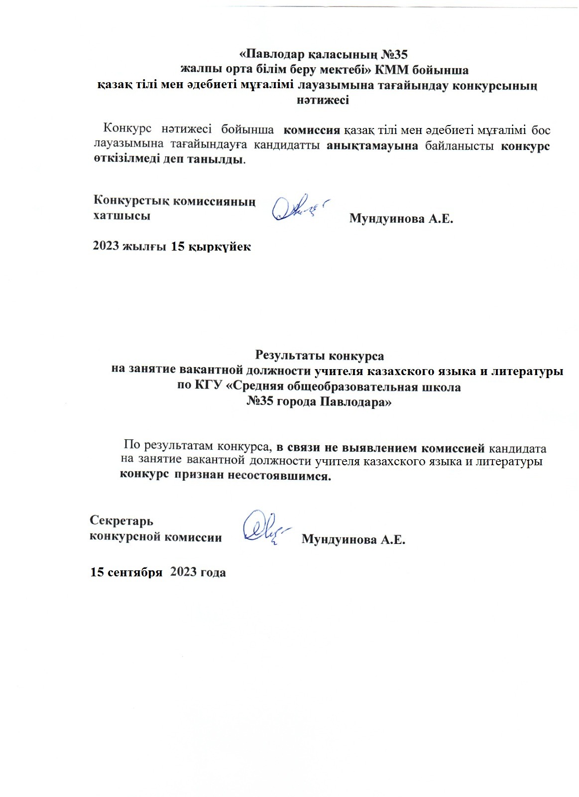 Результаты конкурса на занятие вакантных и (или) временно вакантных должностей педагогов по КГУ «Средняя общеобразовательная школа №35 города Павлодара» | Скачать |