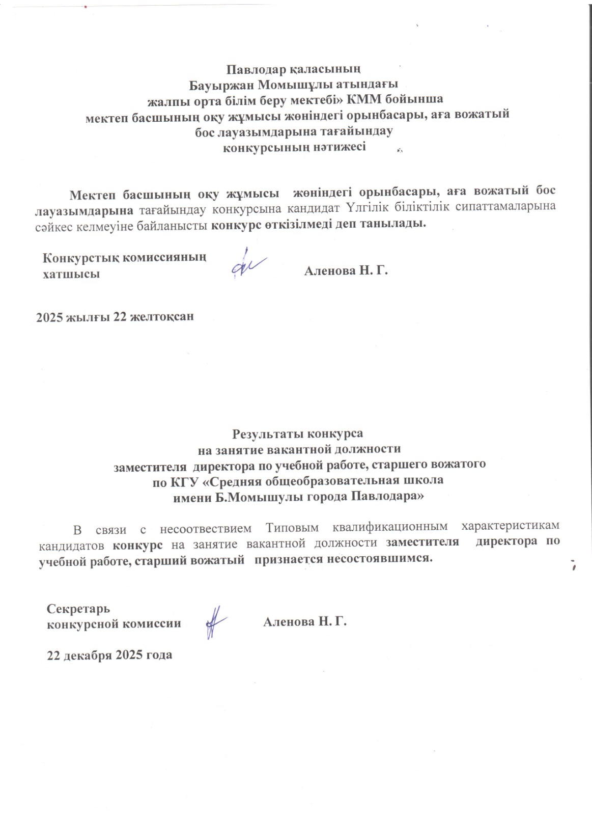 КГУ «Средняя общеобразовательная школа имени Бауыржана Момышулы города Павлодара» объявляет конкурс на должность заместителя директора по учебной работе с казахским языком обучения (1 ставка)