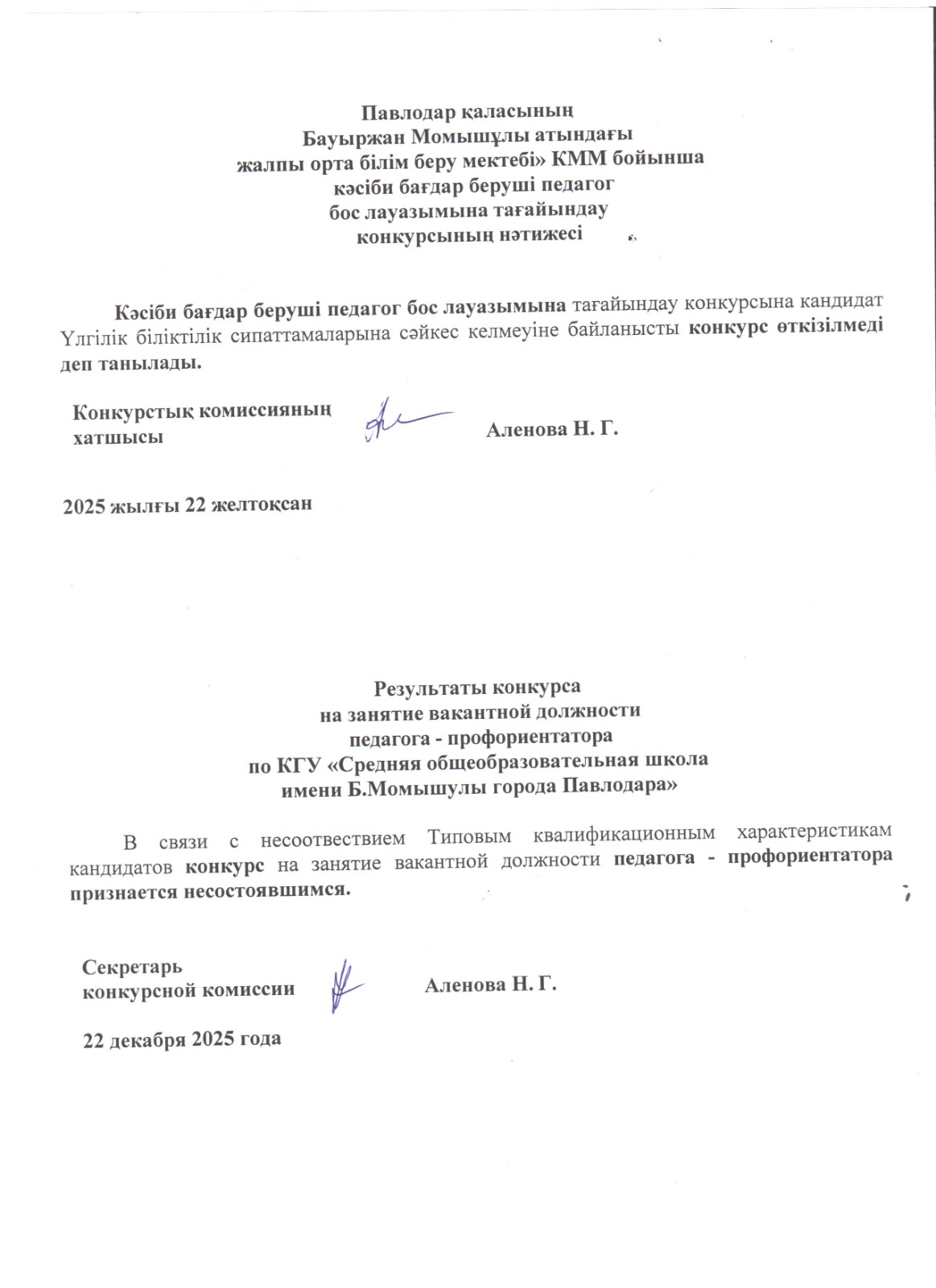 КГУ «Средняя общеобразовательная школа имени Бауыржана Момышулы города Павлодара» объявляет конкурс на должность педагога-профориентатора с казахским языком обучения (1 ставка)