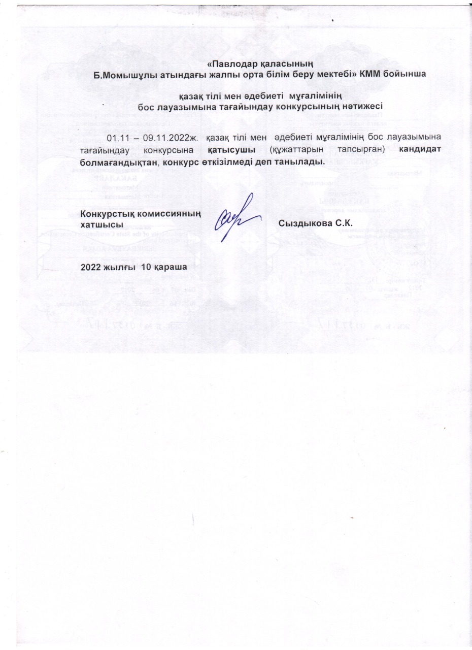 "Павлодар қаласының Б.Момышұлы атындағы жалпы орта білім беру мектебі" КММ бойынша мемлекеттік тілде оқытылатын қазақ тілі мен әдебиеті мұғалімі бос лауазымдарына тағайындау конкурсының нәтижесі | Скачать |