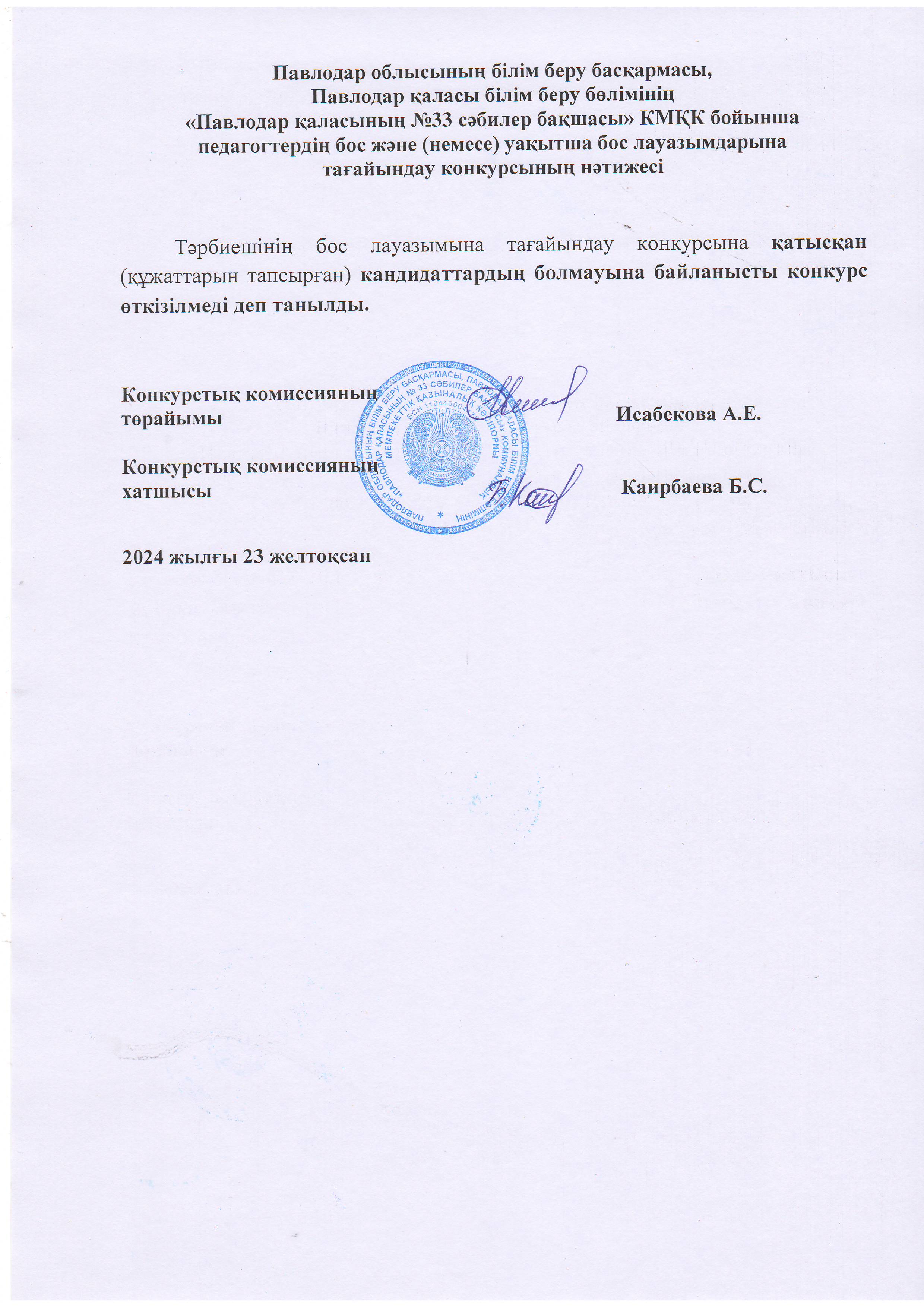 Павлодар облысының білім беру басқармасы, Павлодар қаласы білім беру бөлімінің «Павлодар қаласының №33 сәбилер бақшасы» коммуналдық мемлекеттік қазыналық кәсіпорны тәрбиеші уақытша бос лауазымына орналасуға ашық конкурс нәтижесі | көшіріп алу |