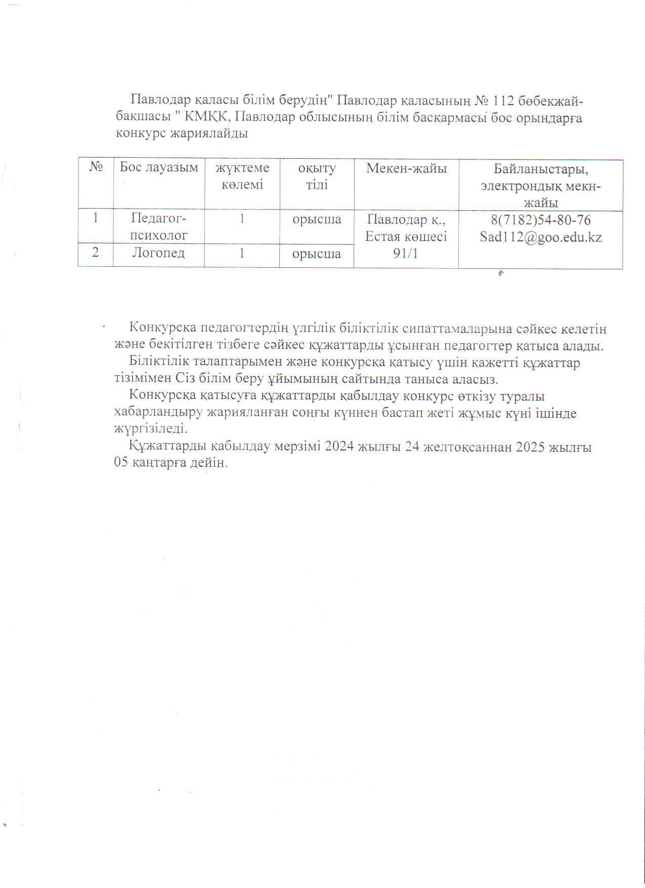 Қазақ тілінде оқытатын 3 тәрбиеші бос лауазымына байланысты ашық конкурс жариялайды 24.12.2024 | көшіріп алу қарау |