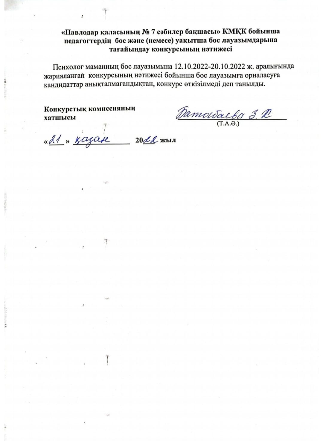 Тәрбиешінің бос лауазымға тағайындау конкурсының қорытыныдысы | көшіріп алу қарау |