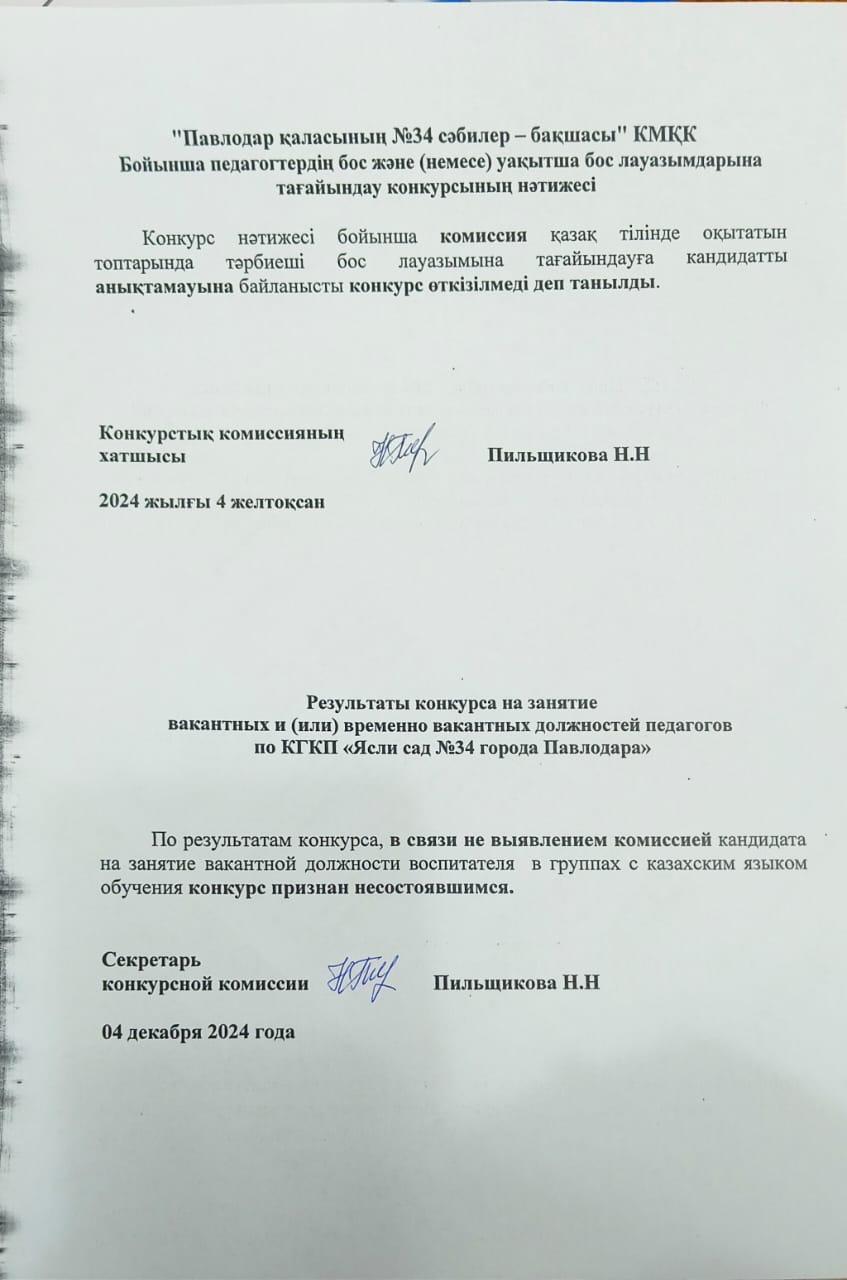 Қазақ тілінде оқытатын тәрбиеші лауазымына конкурстың нәтижесі | Скачать |