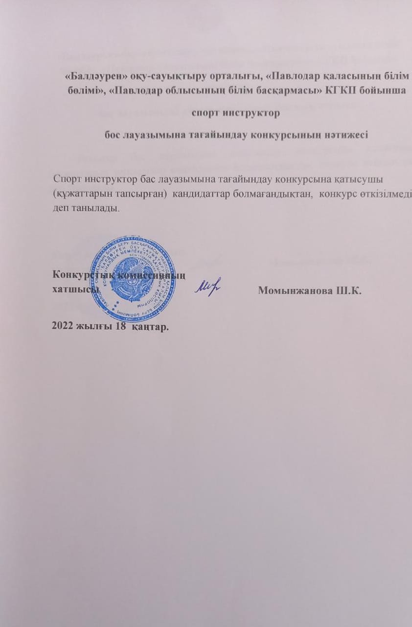 КГКП «Балдәурен» оқу-сауықтыру орталығы, «Павлодар қаласының білім бөлімі», «Павлодар облысының білім басқармасы» спорт нұсқаушысы лауазымының конкурс нәтижесі. | көшіріп алу |