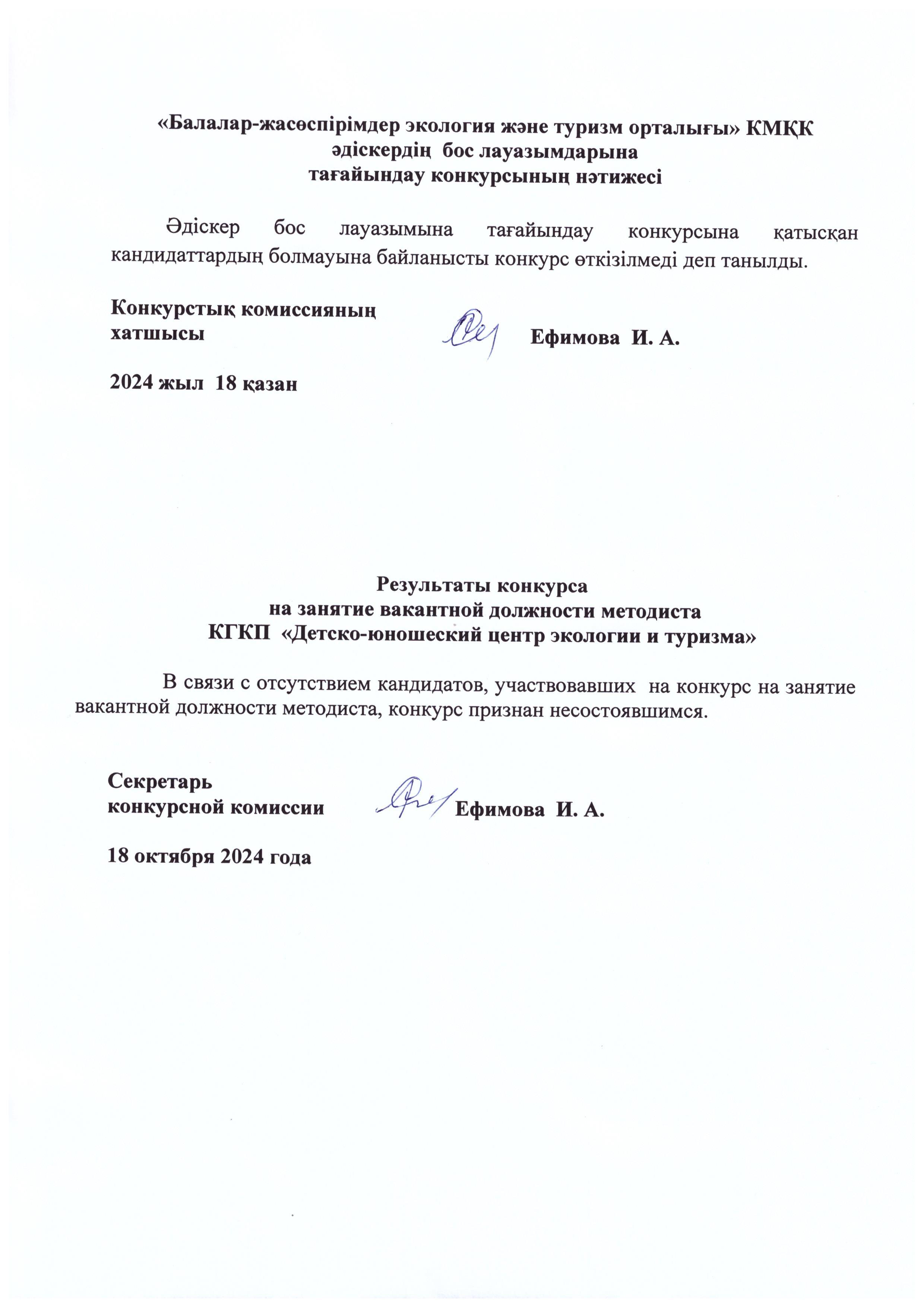 «Балалар-жасөспірімдер экология және туризм орталығы» КМҚК әдіскердің бос лауазымдарына тағайындау конкурсының нәтижесі | көшіріп алу |